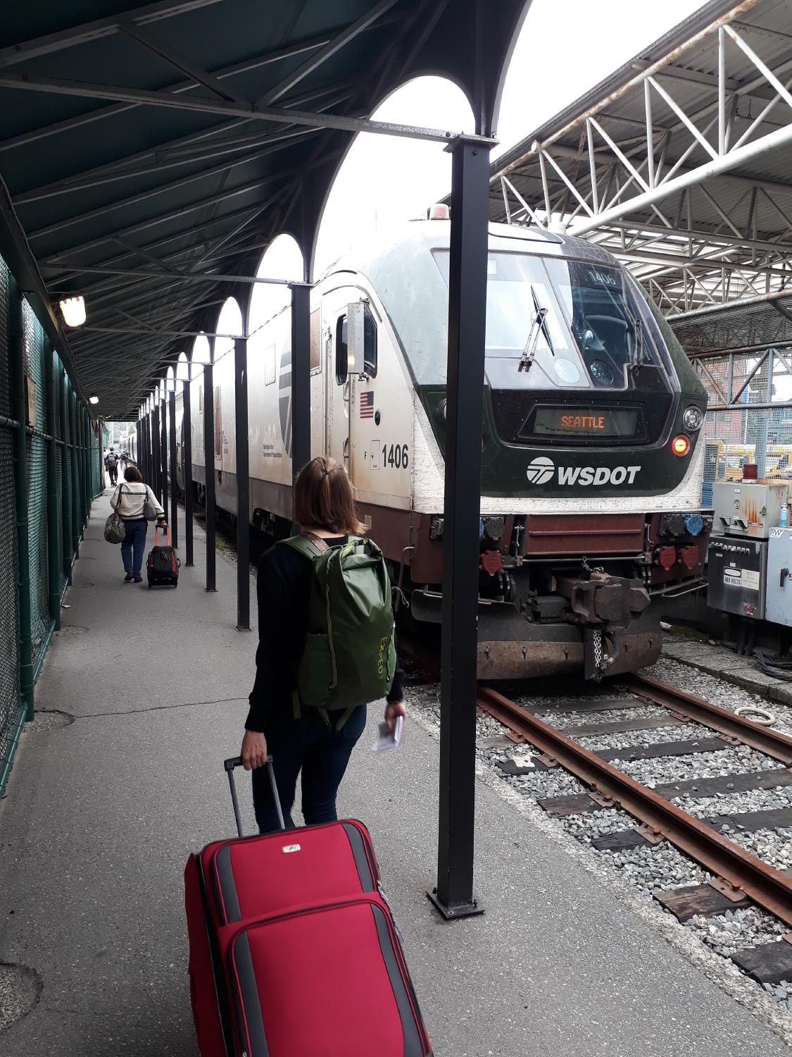 Natürlich kommt sonst fast niemand auf die Idee, mit dem Zug in die USA einzureisen. Am Vancouver Hauptbahnhof fahren gerade einmal zwei Züge am Tag. Wir müssen ein Formular ausfüllen, in welchem wir deklarieren, keine Güter zum Verkauf nach Amerika einzuführen, nicht mehr als je 10'000 US Dollar dabei zu haben, keine Waffen oder Drogen zu schmuggeln, etc… Bei der Einfuhr von Nahrungsmitteln zögern wir kurz, denn wir haben eine beachtliche Menge an Proviant und Schokolade dabei (schliesslich wollen wir in diesen acht Wochen keine amerikanische Schokolade kaufen müssen!), aber wir deklarieren das für uns als Reiseproviant. Nach langem Warten passieren wir dann mit den Letzten den Schalter, lassen ein Foto von uns machen, bezahlen 12 Dollar Einreisegebühren und Simone bekräftigt mit wildem Kopfnicken, dass sie wirklich das erste Mal in die USA einreist. Schliesslich geben wir unsere Koffer beim Gepäckwaggon ab und setzen uns in den Waggon für die Reisenden.