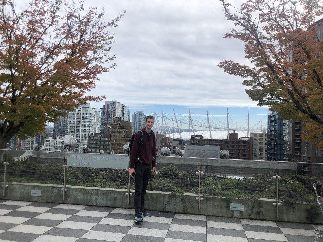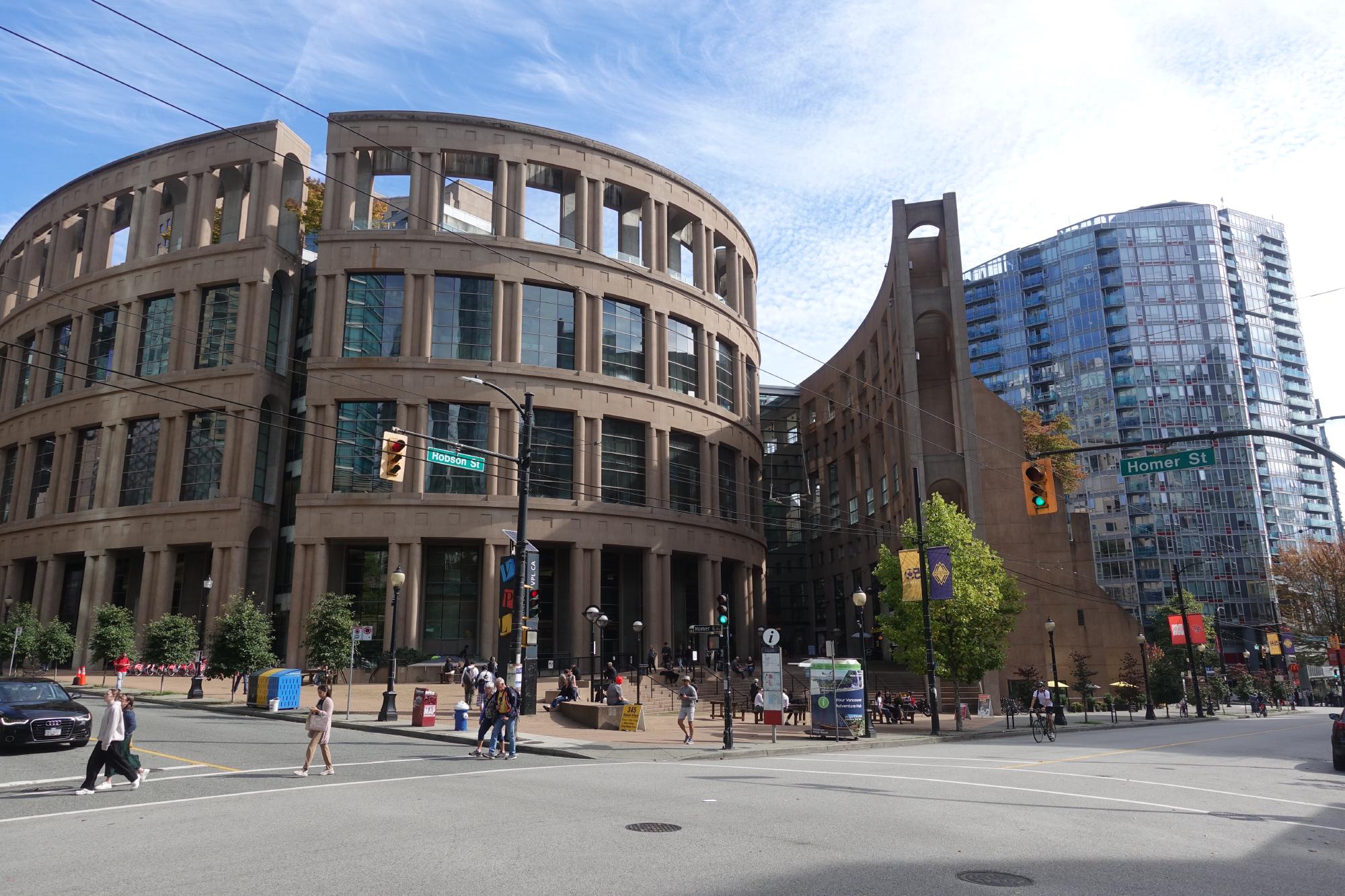 Nach diesem ganzen Essen UND je einem halben Liter Hirnzellen-einfrierendem Cola (die Gläser kommen frisch aus dem Teifkühler, bevor das Getränkt eingefüllt wird) stehen wir wieder draussen und machen noch einen Verdauungsspaziergang durch Vancouvers Innenstadt. Dabei besuchen wir die Public Library und schauen uns die Aussicht von der Terrasse im neunten Stock an.