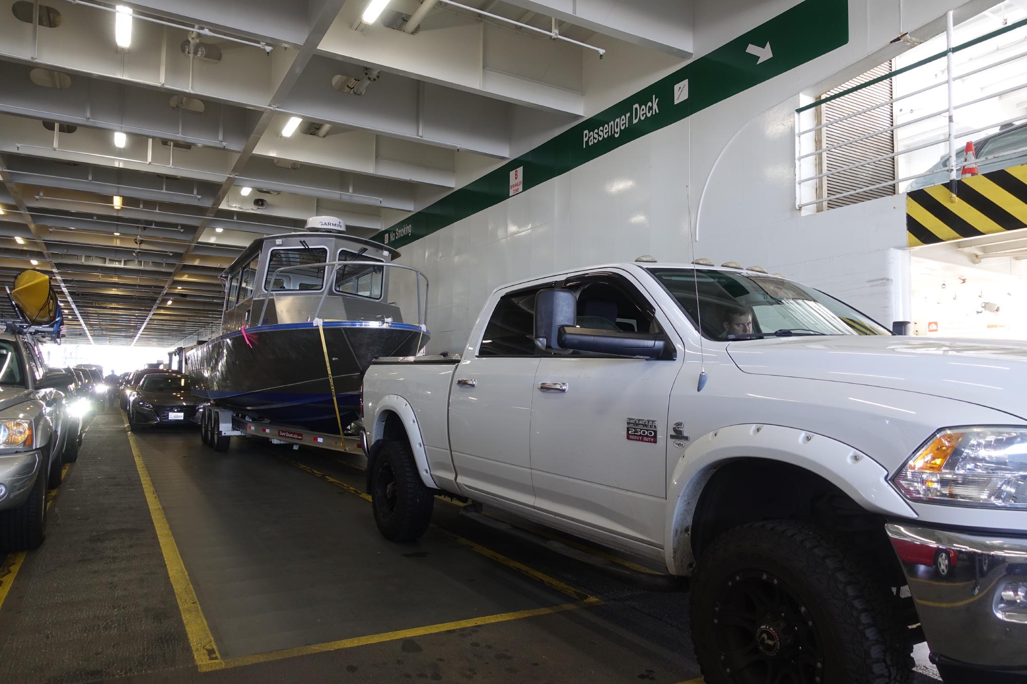 Wir snacken ein Mittagessen und dann gehts auch schon los auf die Fähre. Niemand zuckt mit der Wimper, als wir mit unserem riesigen Wohnmobil auftauchen, erst ab 30 Fuss Länge gilt der Lastwagentarif. Wir müssen nur den Propan-Tank abhängen (zum Glück hat es da eine aufmerksame Kassiererin, wir haben das zwar gelesen, aber doch schon lange wieder vergessen) und schon fahren wir auf das Schiff.