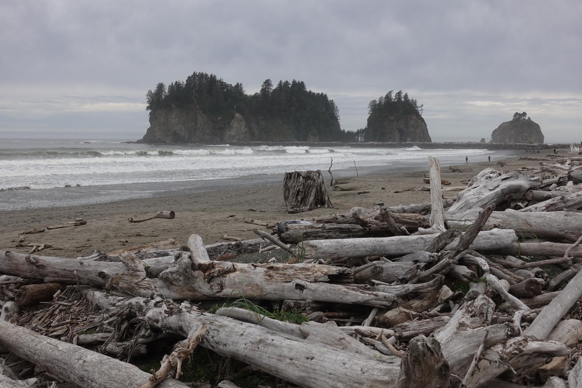 Zurück beim Camper steigen wir ein und fahren um ca. 10 Uhr los, unser packendes Hörbuch von gestern läuft ungefähr den ganzen Tag (ausser in den Funklöchern, wir sind heute ziemlich in der Pampa unterwegs). Wir hören “Die Seiten der Welt”, danke Thi für deinen guten Tipp! Heute gehts auf der Olympic-Halbinsel den Küstenstrassen entlang. Wir halten immer mal wieder an einem schönen Strand an um ein paar Fotos zu machen und die Beine zu vertreten.