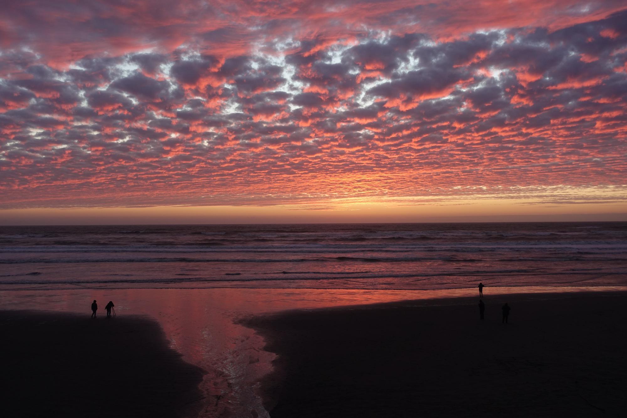 Wir geniessen also unser Mittagessen an der Wärme im Camper und schauen dem Treiben draussen zu; es hat hier Surfer in Neoprenanzügen und Kinder, die mitsamt ihren Kleidern in die Wellen rennen und klatschnass vor Freude quietschen (ist es so wohl wärmer als im Badeanzug?). Nach dem Essen spazieren wir auch hier noch etwas dem Strand entlang und bestaunen das viele Schwemmholz.