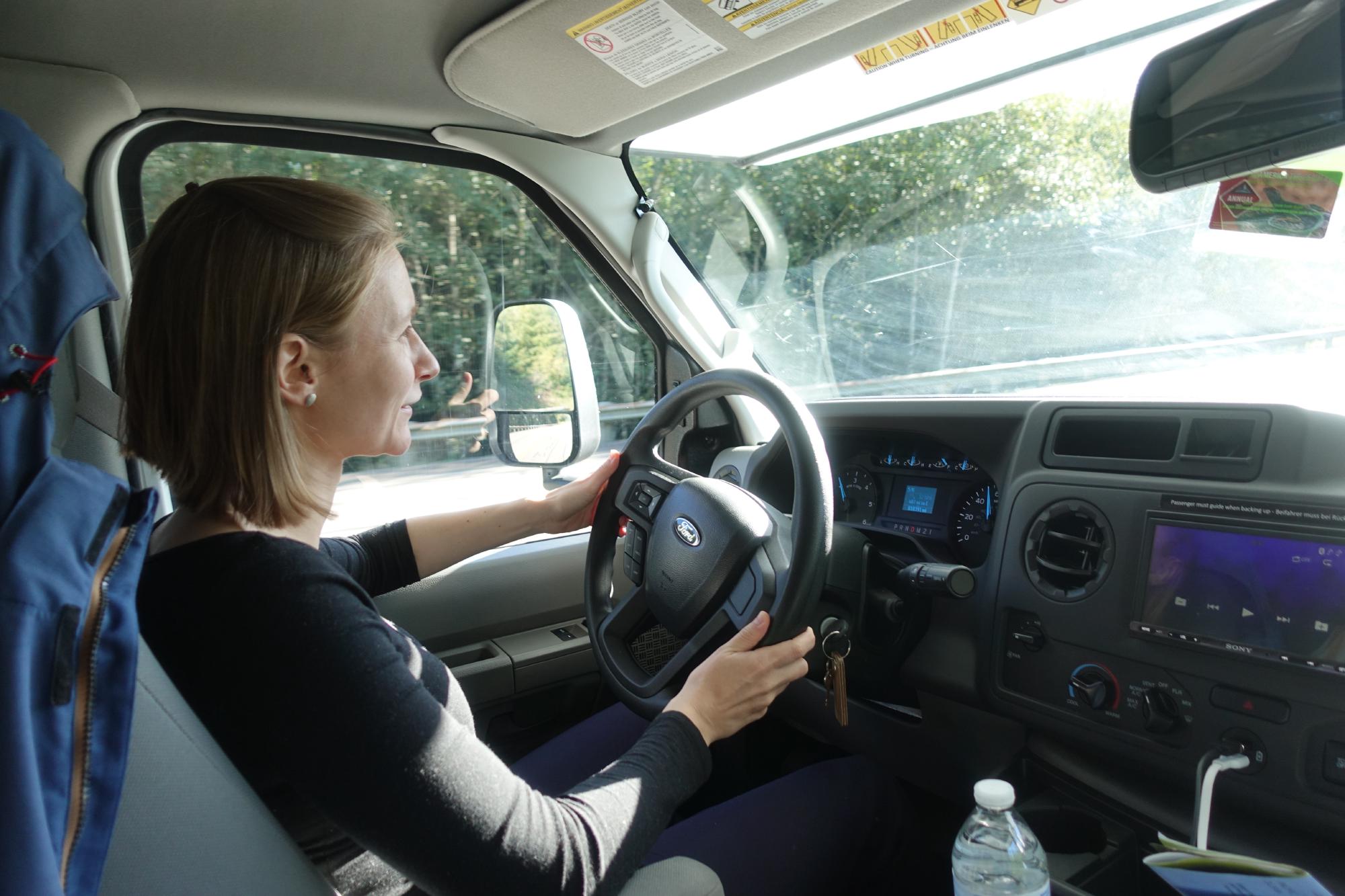 Wir suchen uns im Dollar-Store (mittlerweile kostet alles 1.25 USD plus Tax, was aber immer noch sehr billig ist) ein paar Plastikkistchen, um in den Schränken das herumfliegende Zeugs besser sortieren zu können. Dann geht es weiter. Bei schönem Wetter und leeren Landstrassen getraut sich sogar Simone mal noch hinters Steuer und findet bald Gefallen daran, mit dem riesigen Camper in die Kurven zu liegen. Es ist aber noch streng, das Steuerrad braucht recht viel Kraft in den Armen!