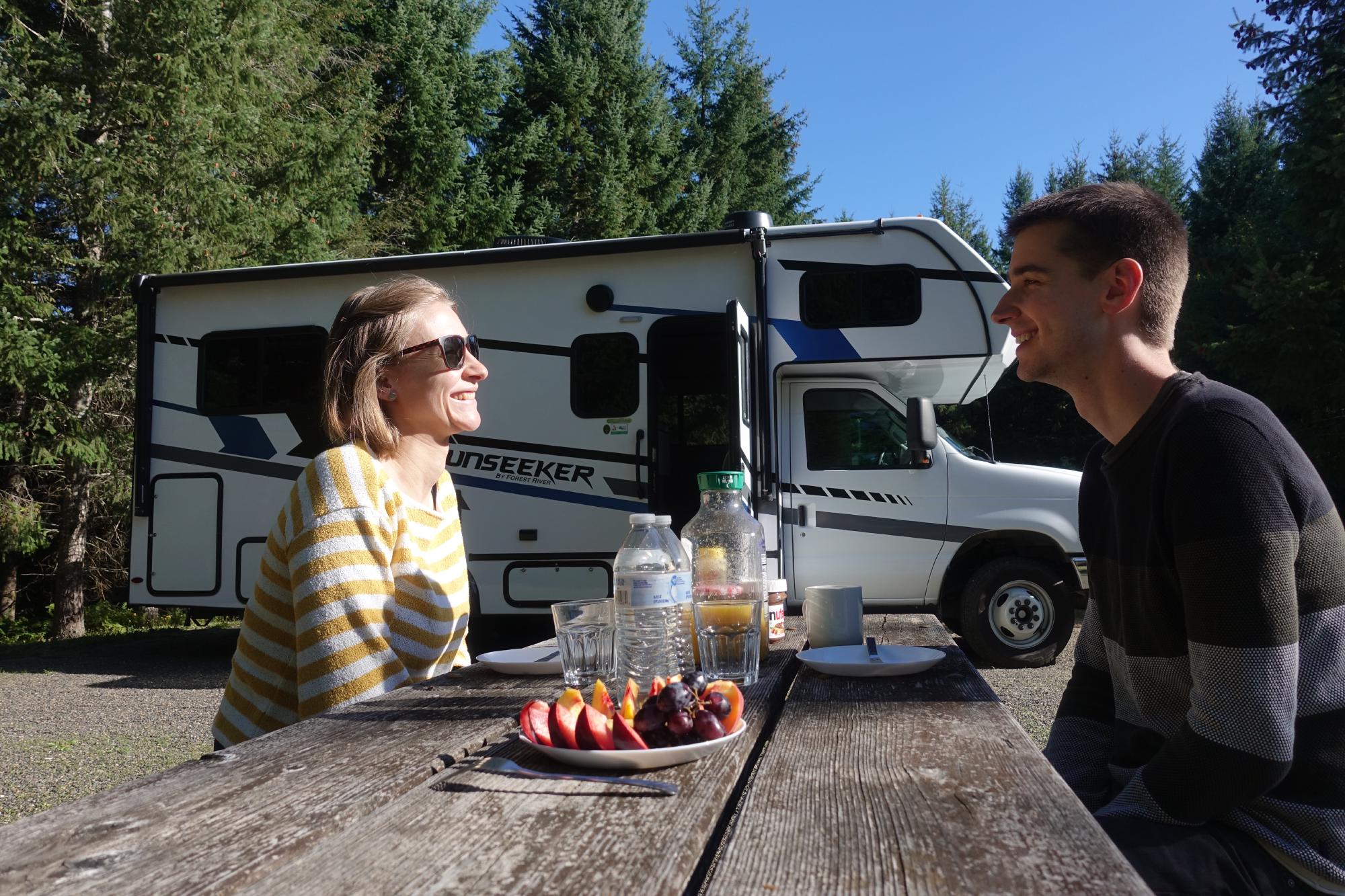 Es ist traumhaft schön und warm und wir müssen erst um 13 Uhr auschecken, also geniessen wir noch ein paar ruhige, gemütliche Stunden und probieren dabei unsere Marquise und die Campingstühle aus. Schliesslich machen wir den Camper reisefertig und fahren los in Richtung Portland.