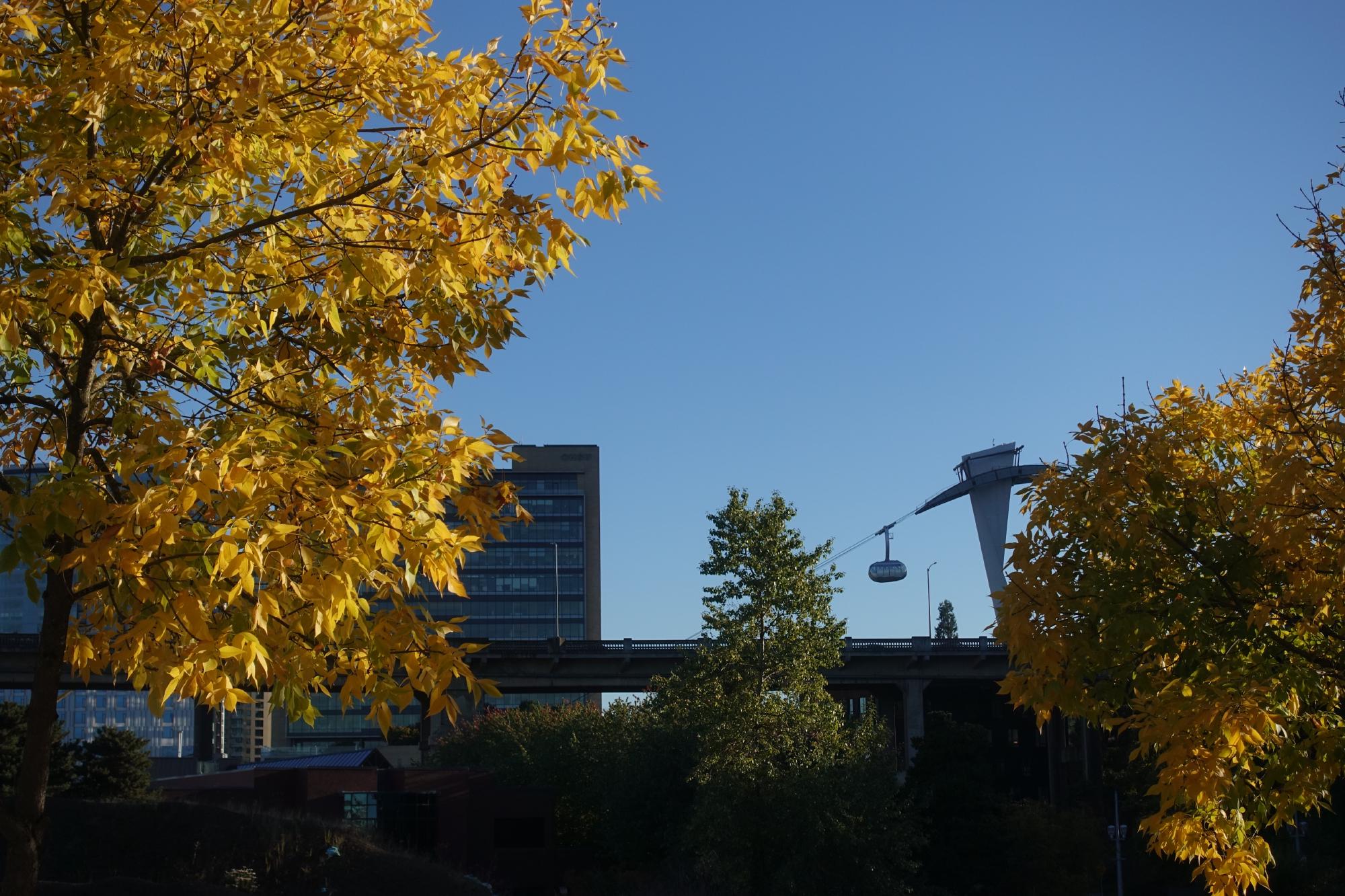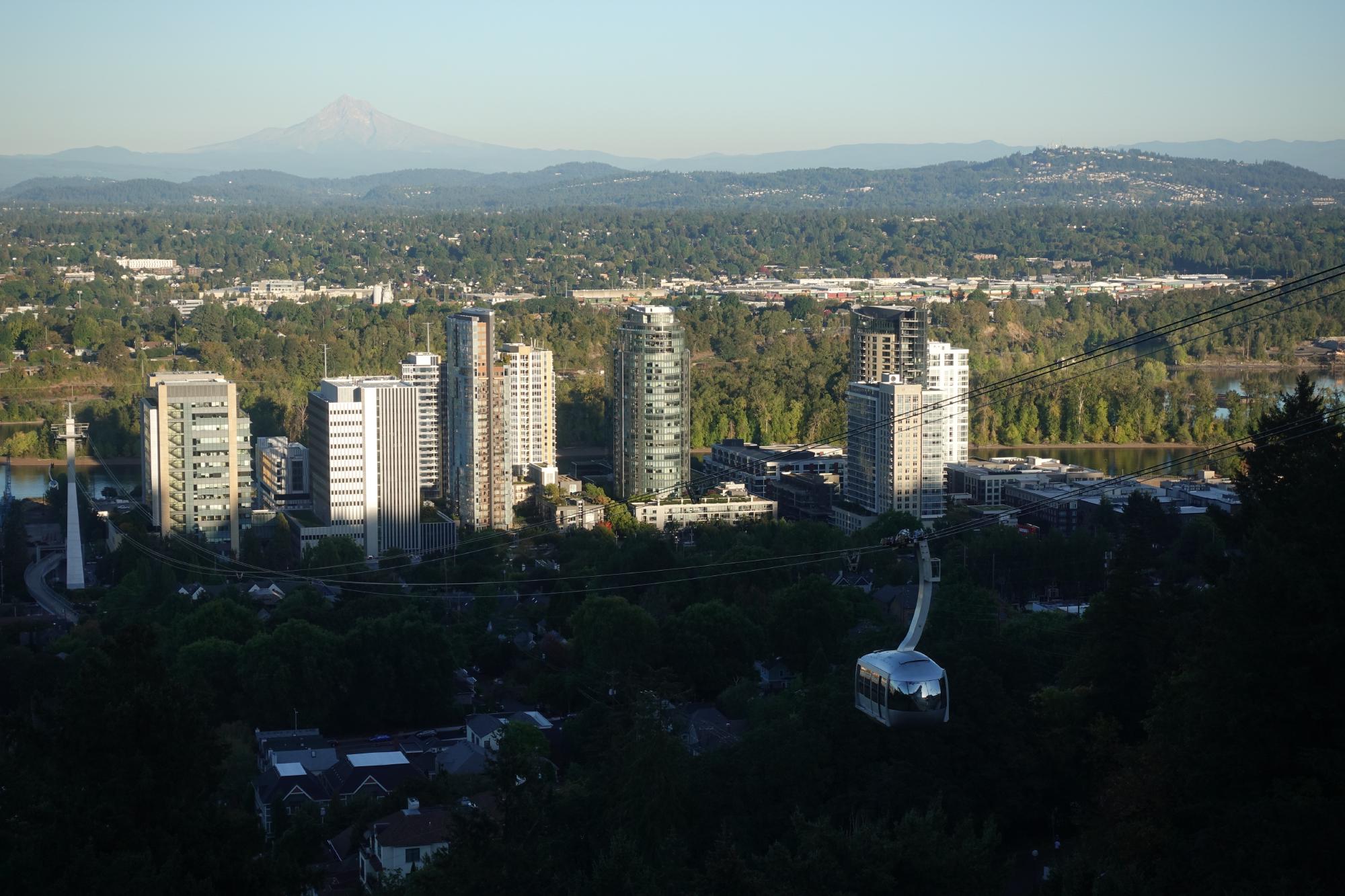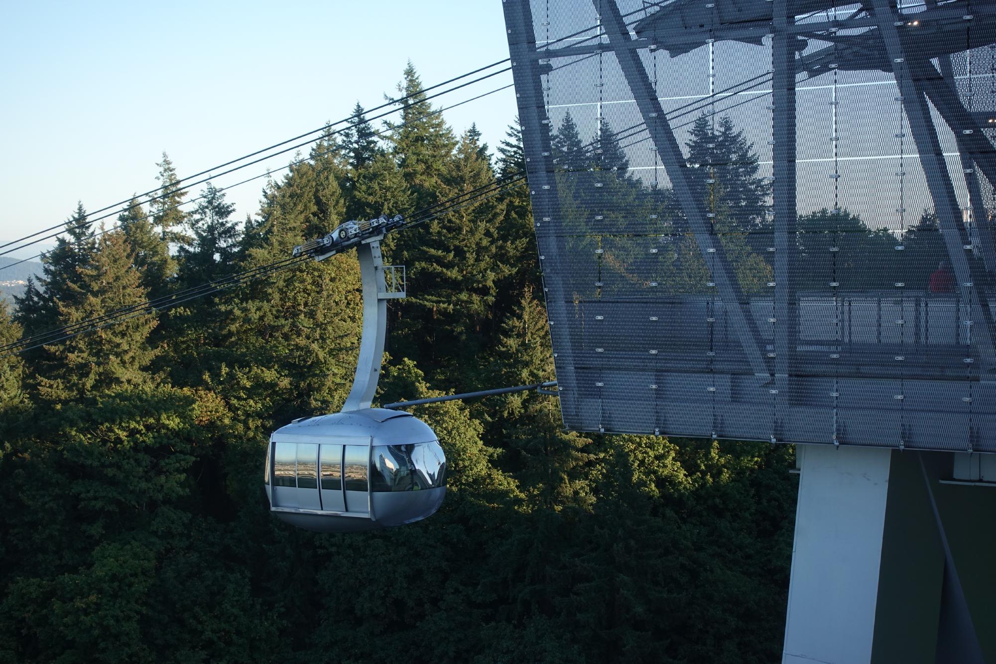 Irgendwie etwas enttäuscht von dieser Innenstadt beschliessen wir, einem Tipp aus der Schweiz zu folgen (danke, Erich!). Wir fahren mit der orangen Tramlinie an den Südrand der Stadt. Hier fühlen wir uns schon viel wohler. Es hat viele Velos und farbig gekleidete Spital-Mitarbeitende. Von hier aus ist der obere Teil des Unispitals mit dem “Portland Aerial Tram” erreichbar, eine Seilbahn, die unter anderem von Garaventa gebaut wurde.