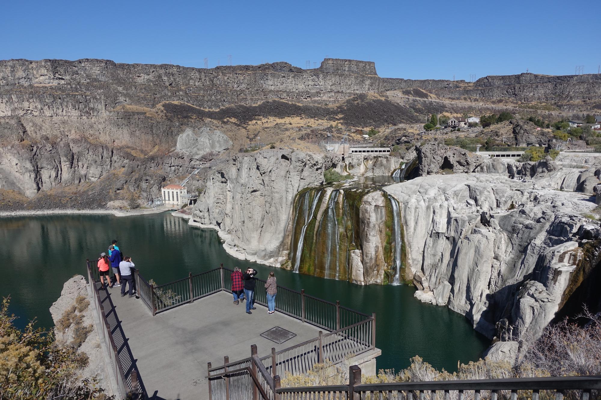 In der ersten Rechtskurve glutschelt und röchelt es hinter uns; wir haben während den letzten drei Tagen den Frischwassertank bis auf den letzten Tropfen geleert und die Abwassertanks sind randvoll… mal schauen, wie lange das gut geht! Wir fahren durch Twin Falls hindurch um das Wahrzeichen zu besuchen: Die Shoshone Falls, die “kleine” (aber höhere!) Version der Niagara-Fälle. Doch wir habens auf der Webcam schon gesehen: Sie sind ziemlich ausgetrocknet!
