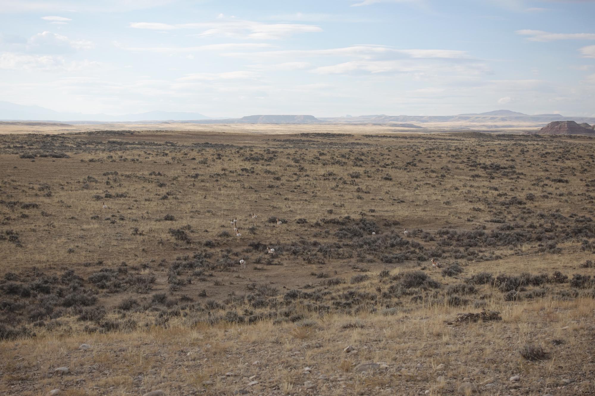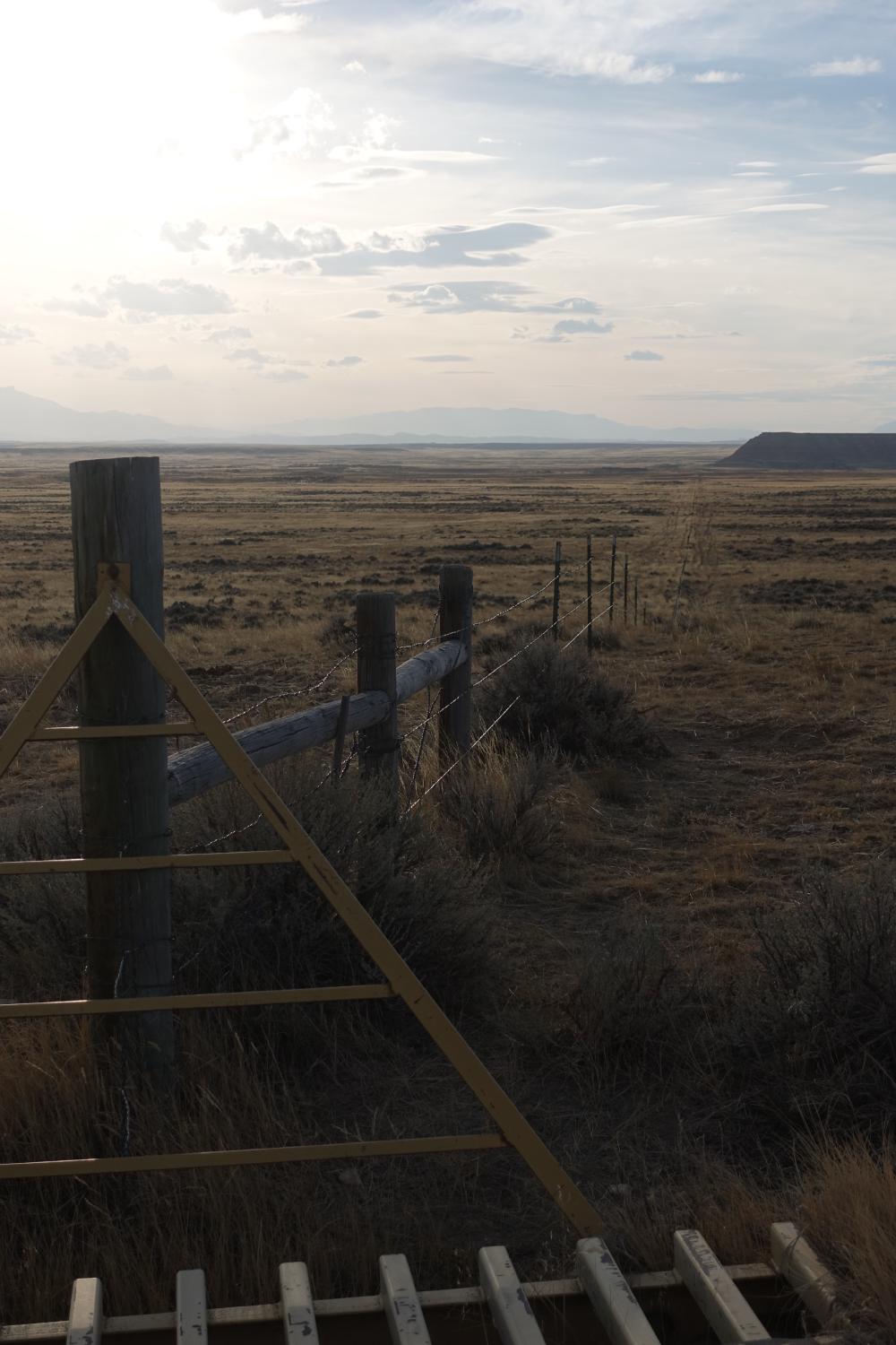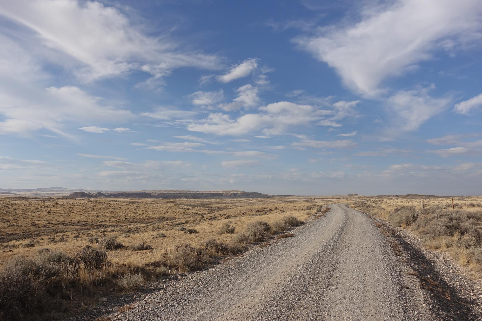 Mit frischem Wasser machen wir uns auf in den Osten von Cody. Cody ist bekannt für seine wilden Mustangs (die scheinen aber schon Winterschlaf zu halten) und das Rodeo (macht erst nächsten Sommer wieder auf), aber wir ahnen in diesem Moment noch nicht, dass das ganze Unterfangen erfolglos bleiben wird. Wir fahren also auf dem Wild Horse Highway über die weiten Flächen, auf denen wir uns super gut galoppierende Pferde vorstellen können, bis zur recherchierten Abzweigung. Leider handelt es sich um einen Kiesweg und wir können den Camper nicht da drauffahren, spätestens beim Kreuzen mit einem anderen Auto wäre Schluss (manchmal wäre ein kleines VW-Büsli schon praktischer). Also stellen wir den Camper ab und marschieren zu Fuss los. Die Nachmittagssonne wärmt die Steppe ziemlich auf und wir haben auf der Karte gesehen, wie gross das Mustang-Gebiet ist… Eigentlich ein unmögliches Unterfangen, aber uns tun ein paar Schritte zu Fuss gut. Die Strasse führt ganz leicht bergauf und wir entscheiden uns immer mal wieder für noch einmal die nächste Hügelkuppe, vielleicht sehen wir die Mustangs von dort… Aber irgendwann sieht immer alles wieder gleich aus und wir beschliessen, umzudrehen.