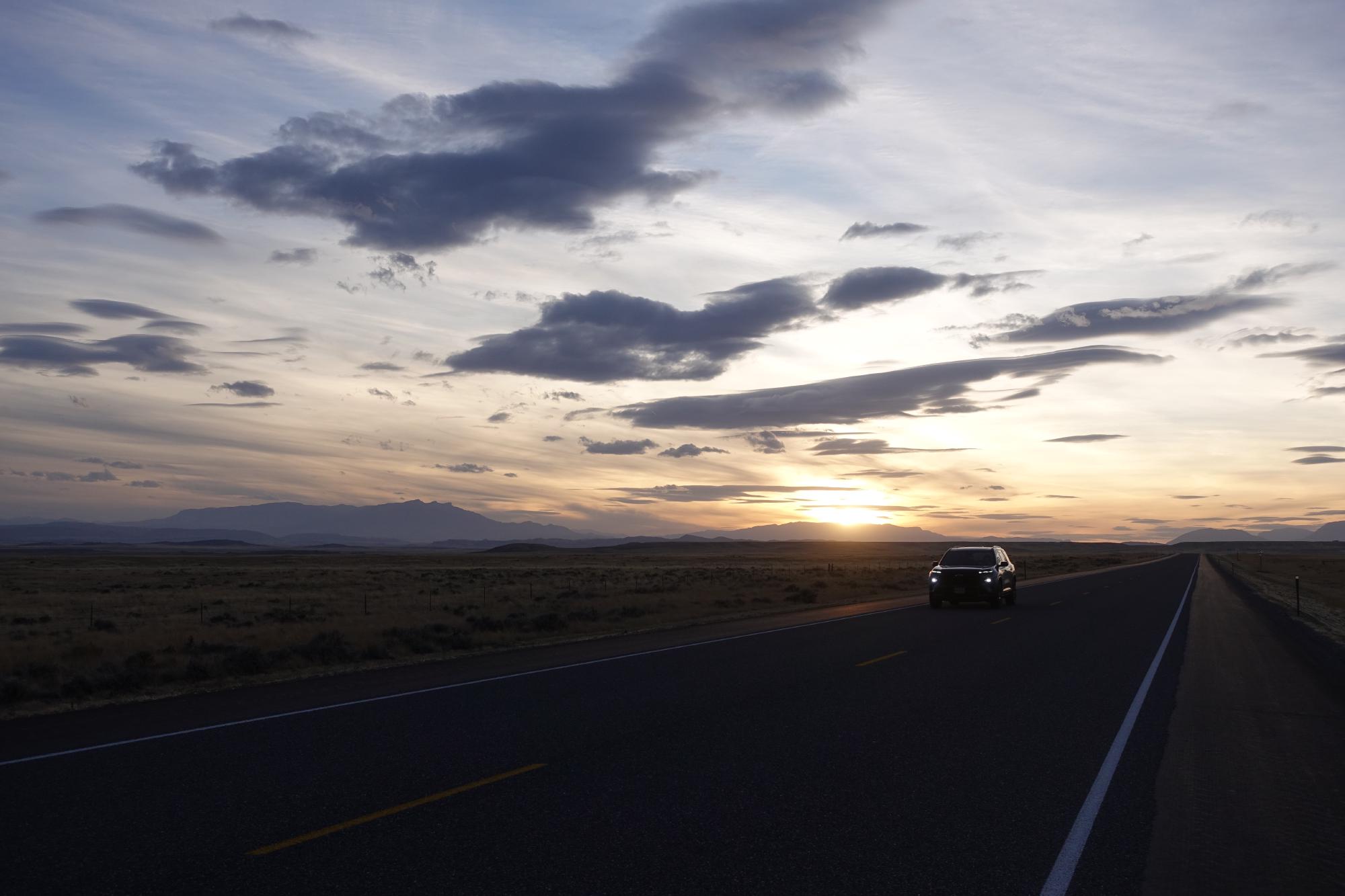 Um 18h sind wir zurück beim Camper und überlegen, wie es nun weitergehen soll. Wir müssen morgen durch den Yellowstone und den Grand Teton Nationalpark fahren und im Süden wieder raus, weil wir unterwegs nirgends eine Übernachtungsmöglichkeit haben (entweder verboten oder ausgebucht). Das ist ein ganzes Stückchen und wir beschliessen, heute Abend eine Stunde davon bereits zu fahren und kurz vor dem Yellowstone-Nationalpark unsere Nachtpause zu machen. Schon cool, dass wir so spontan beschliessen können, wohin wir noch fahren und was wir am nächsten Tag machen, uns gefällts! Wir fahren also in der Abenddämmerung auf die Berge zu, hören dazu gute Musik und sind mega glücklich und zufrieden.