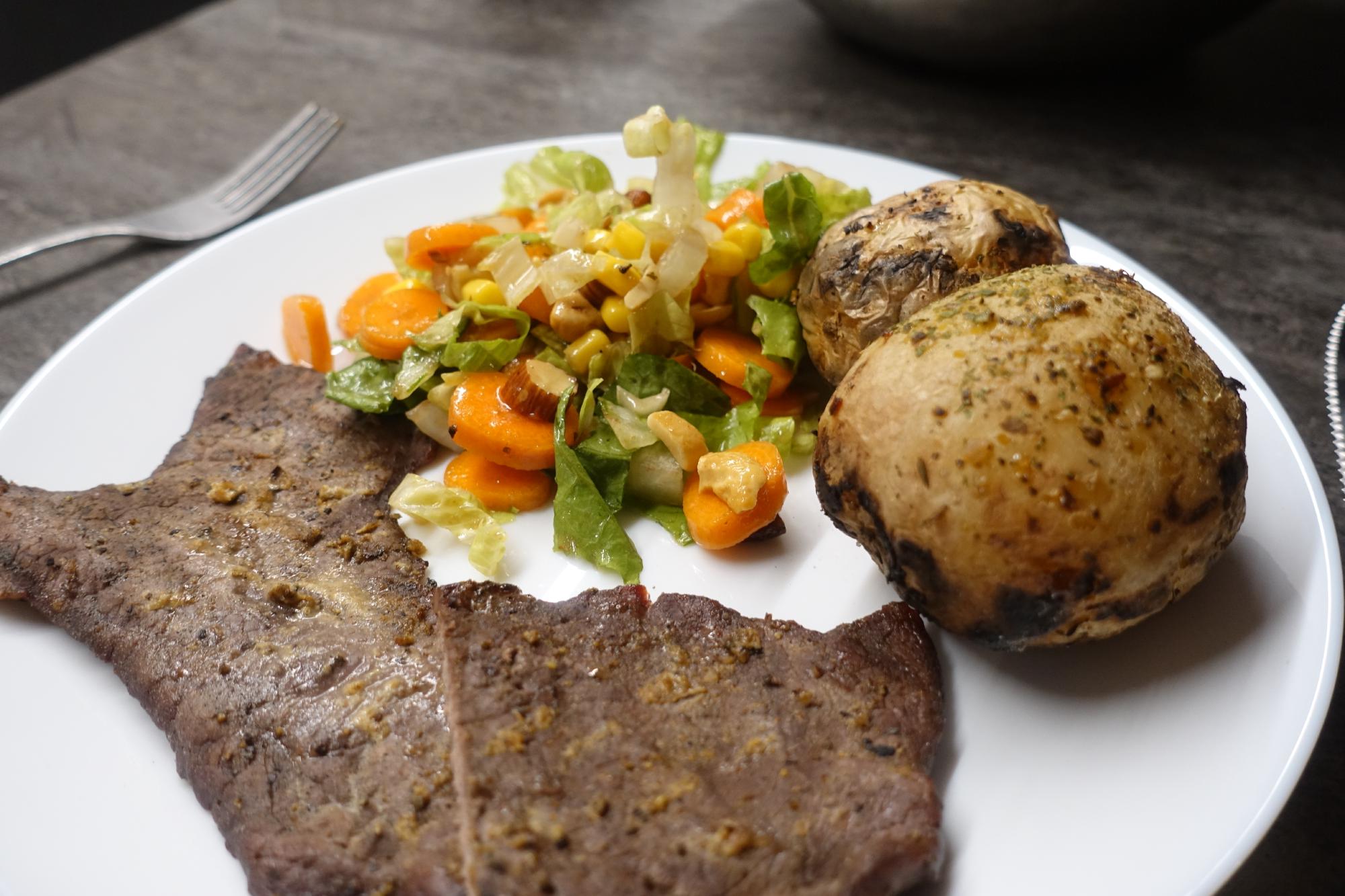 Nach knapp zwei Stunden haben wir uns das Nachtessen dann redlich verdient. Die Plätzli sind geschmacklich super und mit etwas Barbecue-Sauce auch genügend saftig und die Kartoffeln sind tatsächlich durchgegart. Wir sind recht zufrieden mit der ersten Grillaktion der Saison! Ein paar Details gibts noch zu optimieren, aber dazu werden wir in den kommenden Wochen hoffentlich noch die eine oder andere Gelegenheit haben!
