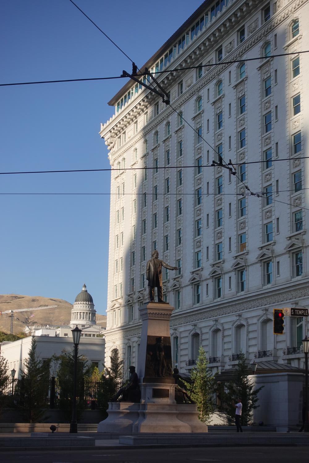 Gleich vor dem Campingplatz liegt eine Tramstation. Wir lösen also ein Ticket und fahren ins Zentrum. Salt Lake City ist Hauptsitz der Church of Jesus Christ of Latter-day Saints, der Mormonen. Im Bundesstaat Utah gehören 61.5% der Bevölkerung dieser Konfession an und das Stadtzentrum von Salt Lake City wird dann auch dominiert von einer riesigen Kirche, dem Tabernakel, einem riesigen Verwaltungsgebäude und vielen weiteren Gebäuden mit Bibliotheken, Schulen usw. der Mormonen (wobei etwa dreiviertel dieser Gebäude gerade renoviert werden). Die Stadt besticht mit der Lage zwischen Hügeln und den vielen grünen Fleckchen und ist recht sauber. Uns fällt auf, wie wenig Randständige dass es hier hat, im Vergleich zu den bisher besuchten grösseren Städten.
