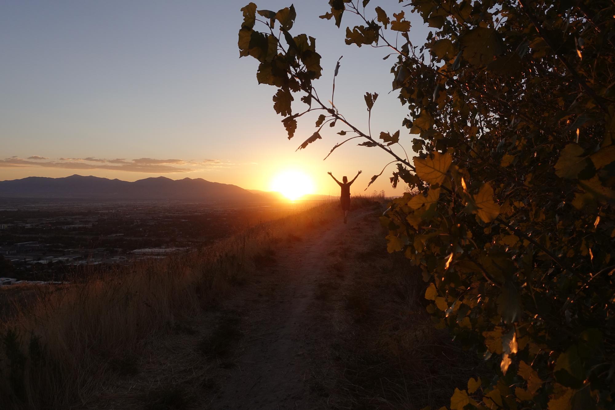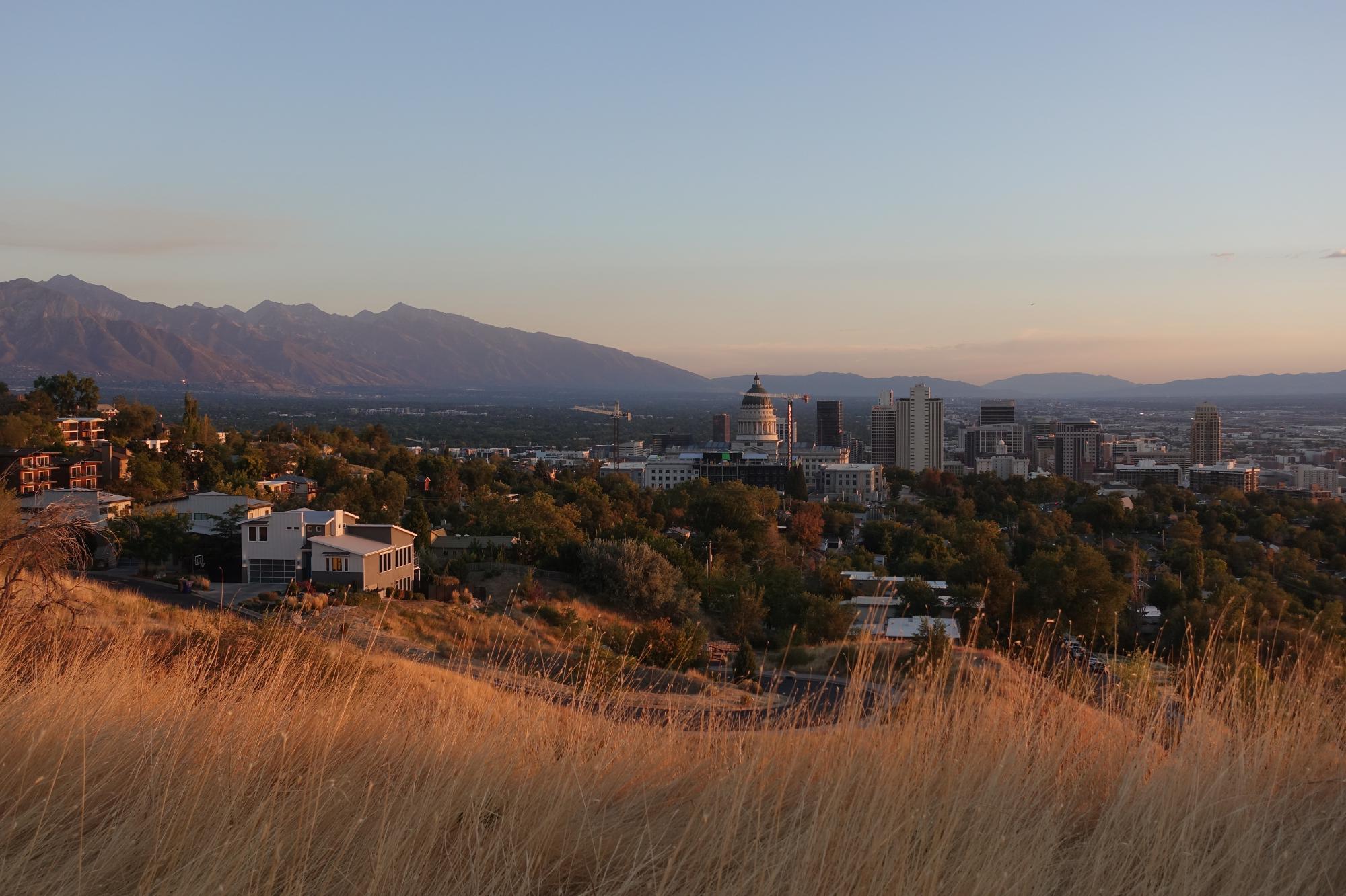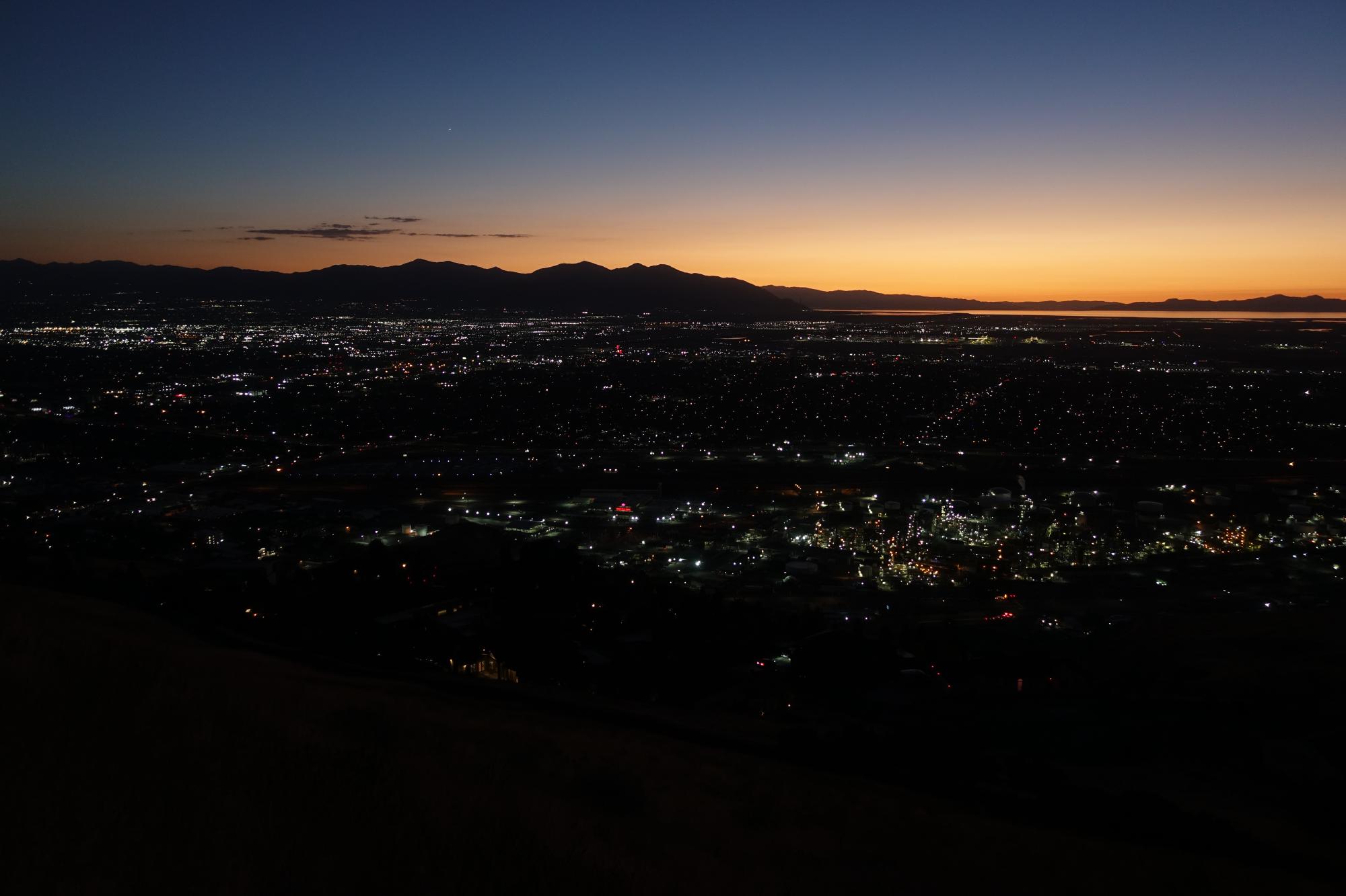 Die Sonne neigt sich rasch dem Horizont zu und wir unterbrechen den Aufstieg einen Moment, um den Sonnenuntergang zu geniessen. Er ist wunderschön. Als wir oben ankommen, erwartet uns ein toller Blick über die Stadt in der Abenddämmerung. Wir setzen uns hin und geniessen das Lichtermeer. Pfeilgerade Strassen, Lichterketten auf der Autobahn, die Anfluglinie der Flugzeuge auf den Flughafen wird durch die Scheinwerfer der hintereinander landenden Riesen sichtbar. Und in der Ferne kommt der Salzsee in Sicht, der der Stadt den Namen gegeben hat.