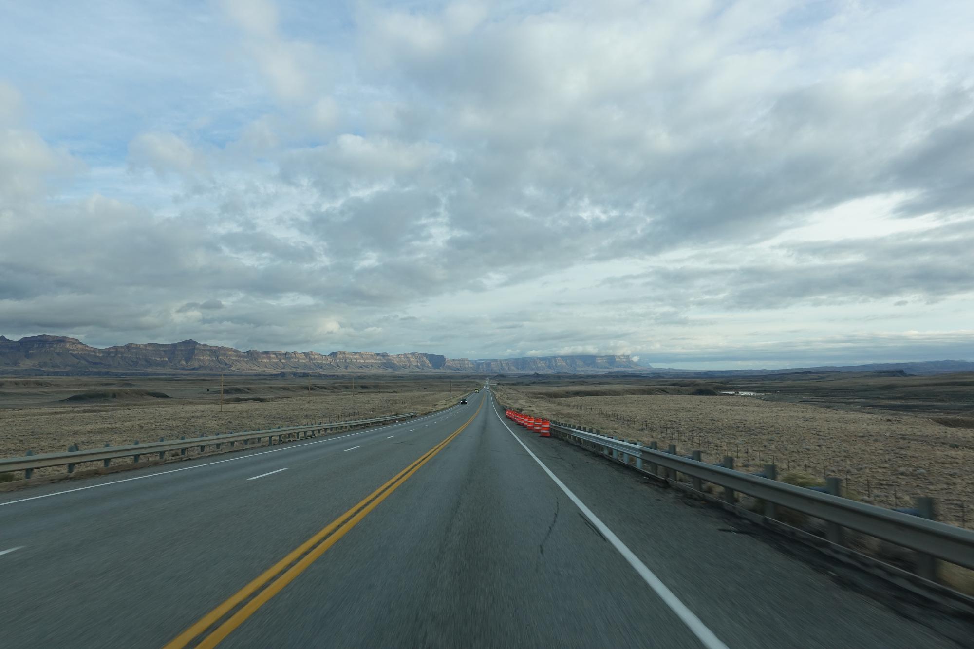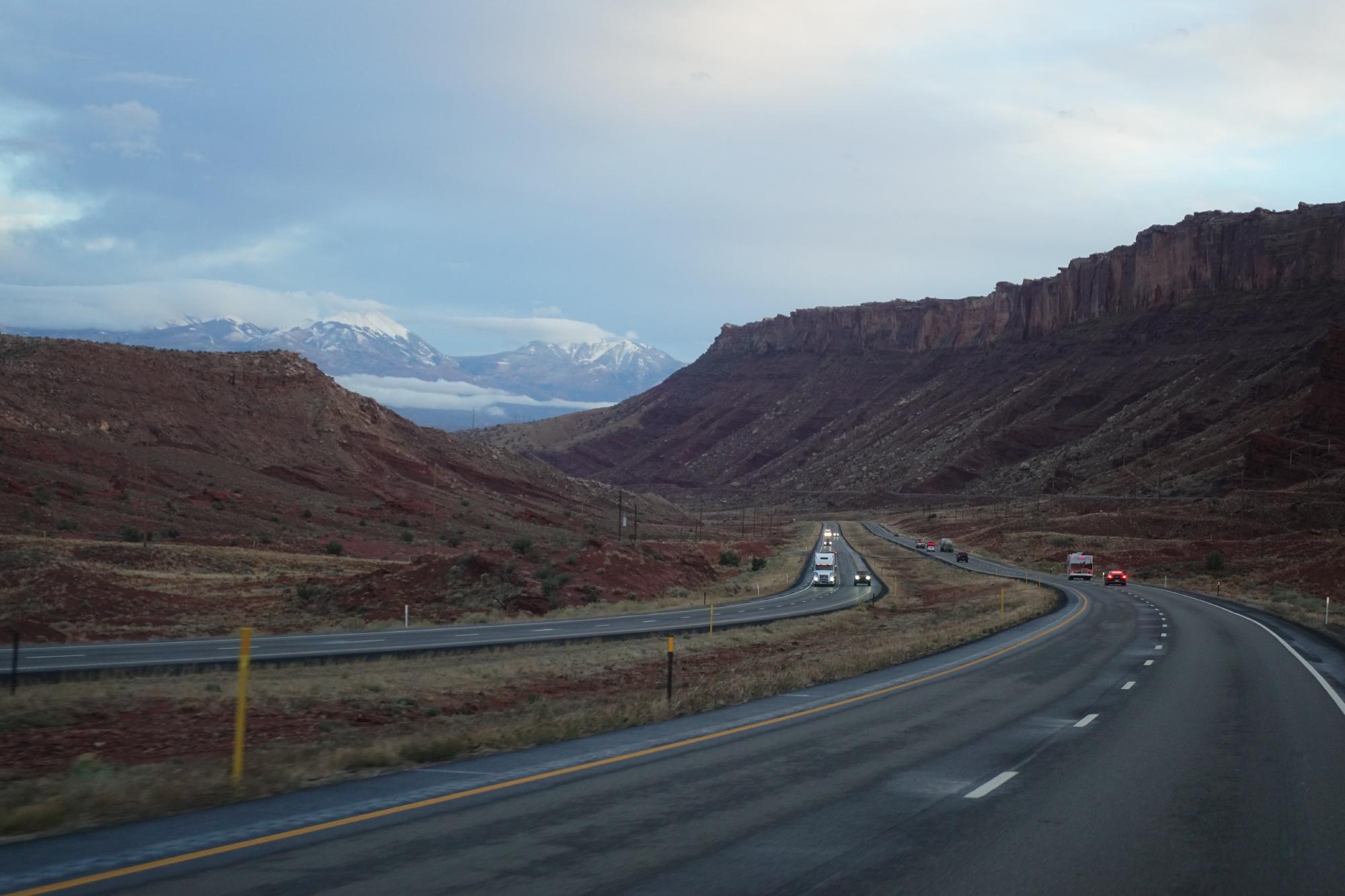 Das grobe Ziel für heute ist Moab. Die reine Fahrzeit beträgt ca. vier Stunden, da trifft es sich gut, dass das Wetter heute immer noch nicht besonders schön ist. Wir fahren auf einer Landstrasse über Pässe, die leicht schneebedeckt sind und kommen mit der Zeit dann langsam in Ebenen mit eindrücklichen Canyon-Strukturen. Die Landschaft ist wunderschön unterwegs. Auf einer Passhöhe machen wir Mittagsrast und kochen Tortellini mit Tomatensauce. Draussen ist es bitterkalt und jemand hat hier einen Schneemann gebaut. Bis wir fertig sind mit Essen, wird er aber von der nächsten Gruppe rastender Jugendlicher demoliert, so dass Marco leider kein Bild davon machen kann.