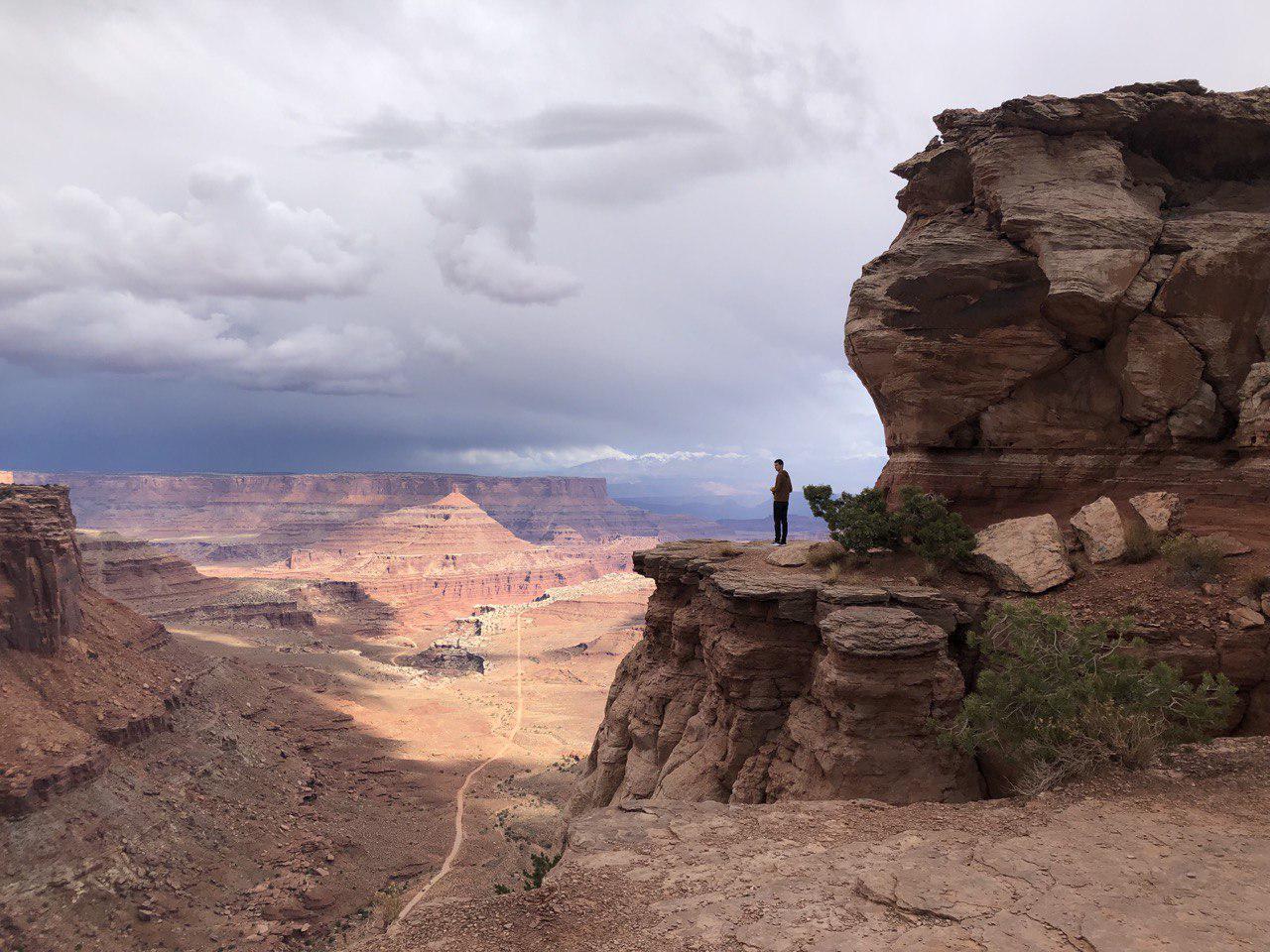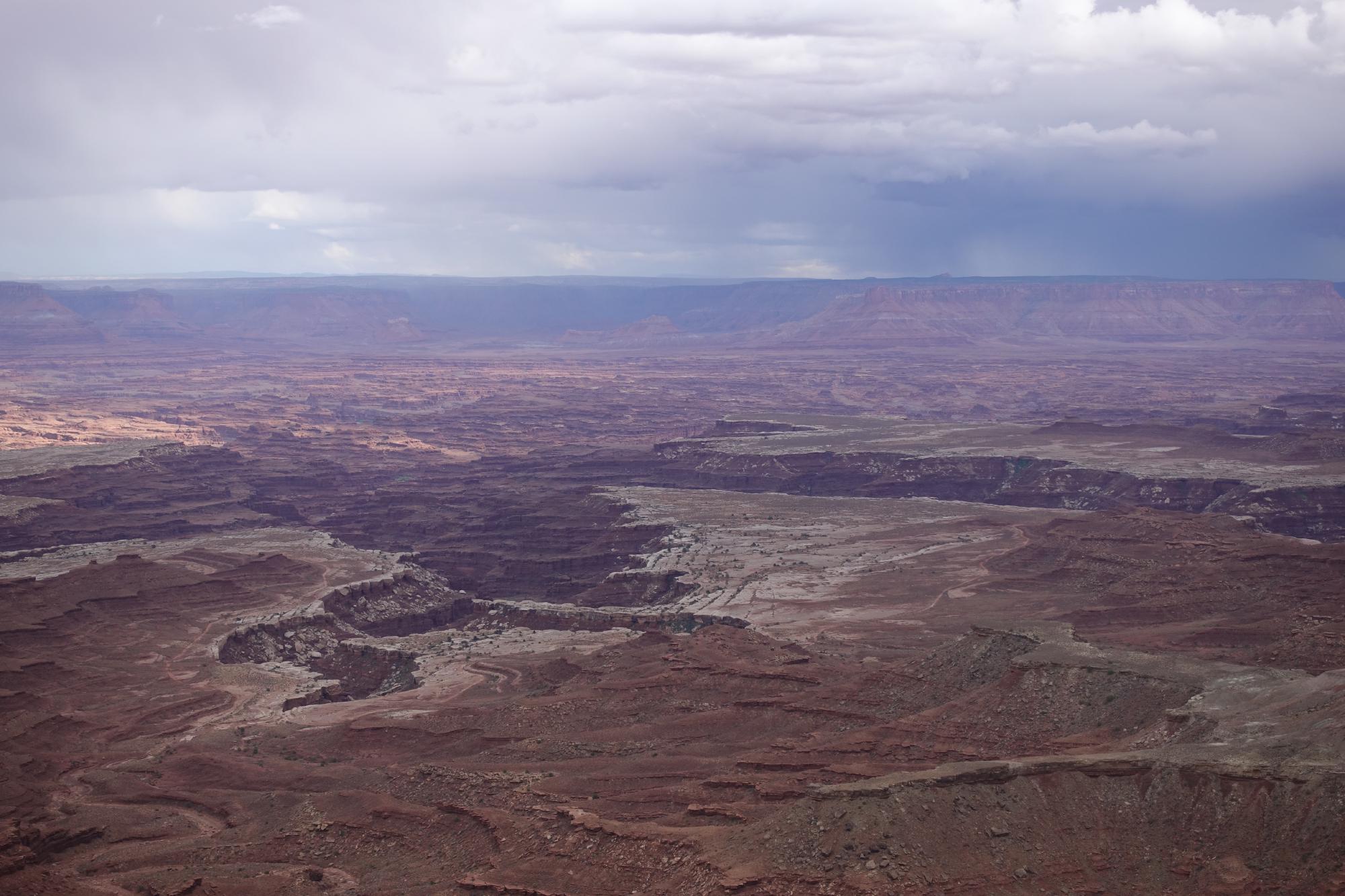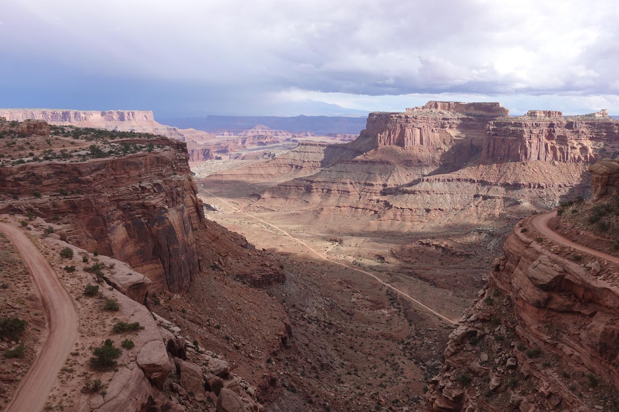 Mit vollen Tanks stellen wir uns am Ausgang der Stadt auf einen Parkplatz und spazieren in den danebenliegenden Park, um das dritte Telefonat von heute zu führen. Dabei sitzen wir in T-Shirts an der Sonne, es ist herrlich warm! Upgedated mit News aus der Schweiz entscheiden wir uns dafür, für den Nachmittag noch in den Arches Nationalpark zu fahren. Der Parkeingang liegt hier gleich um die Ecke und es ist einer der berühmten Nationalpärke hier, den muss man schon gesehen haben! Wir biegen also auf die Strasse zum Tor ein und finden uns in einer doppelspurigen Autoschlange wieder. Ein Schild am Strassenrand verkündet, dass die Wartezeit bis zum Tor ab hier eine Stunde beträgt. Das nächste Schild informiert uns darüber, dass es nicht etwa reicht, ein Ticket für den Park zu lösen; man braucht zusätzlich einen Zeitslot, währenddem man hineinfahren darf. Dieser ist im Voraus zu buchen. Haben wir natürlich weder gewusst noch gebucht. Marco kriegt einen Moment lang fast die Krise. Aber irgendwie stecken wir in der Schlange fest, ohne Timeslot-Ticket und ohne die Möglichkeit, auf der engen Strasse zu wenden mit unserem riesigen Fahrzeug. Fast ein Moment, um loszulachen, aber Simone behält sich im Griff :) Kurz nach dem 30-Minuten-Schild kommt eine Einfahrt, in der wir verbotenerweise wenden und dabei zum Glück von netten und zuvorkommenden Autofahrern unterstützt werden, denn wir brauchen alle drei Spuren für das Manöver. Wir fahren die Strasse zurück bis auf einen Maximum-10-Minuten-Parkplatz, den alle zum Fotografieren des grossen Schildes vom Arches Nationalpark verwenden. Zuerst verabreichen wir Marco ein Coci. Dann beschliessen wir, die erlaubten zehn Minuten etwas auszudehnen und hier einen Zmittag zu picknicken, denn es ist schon 14 Uhr. Und schliesslich sieht die Welt dann bald auch nicht mehr ganz so schwarz aus. In der Nähe liegt der Canyonlands-Nationalpark und wir finden im Internet heraus, dass dieser ein ganz normaler Nationalpark ist, also kein Zeitslot-Ticket benötigt. Wir fahren 45 Minuten zum Teil des Parks, der Island in the Sky genannt wird, und werden hier mit schönen Ausblicken auf die vielen Canyons belohnt.