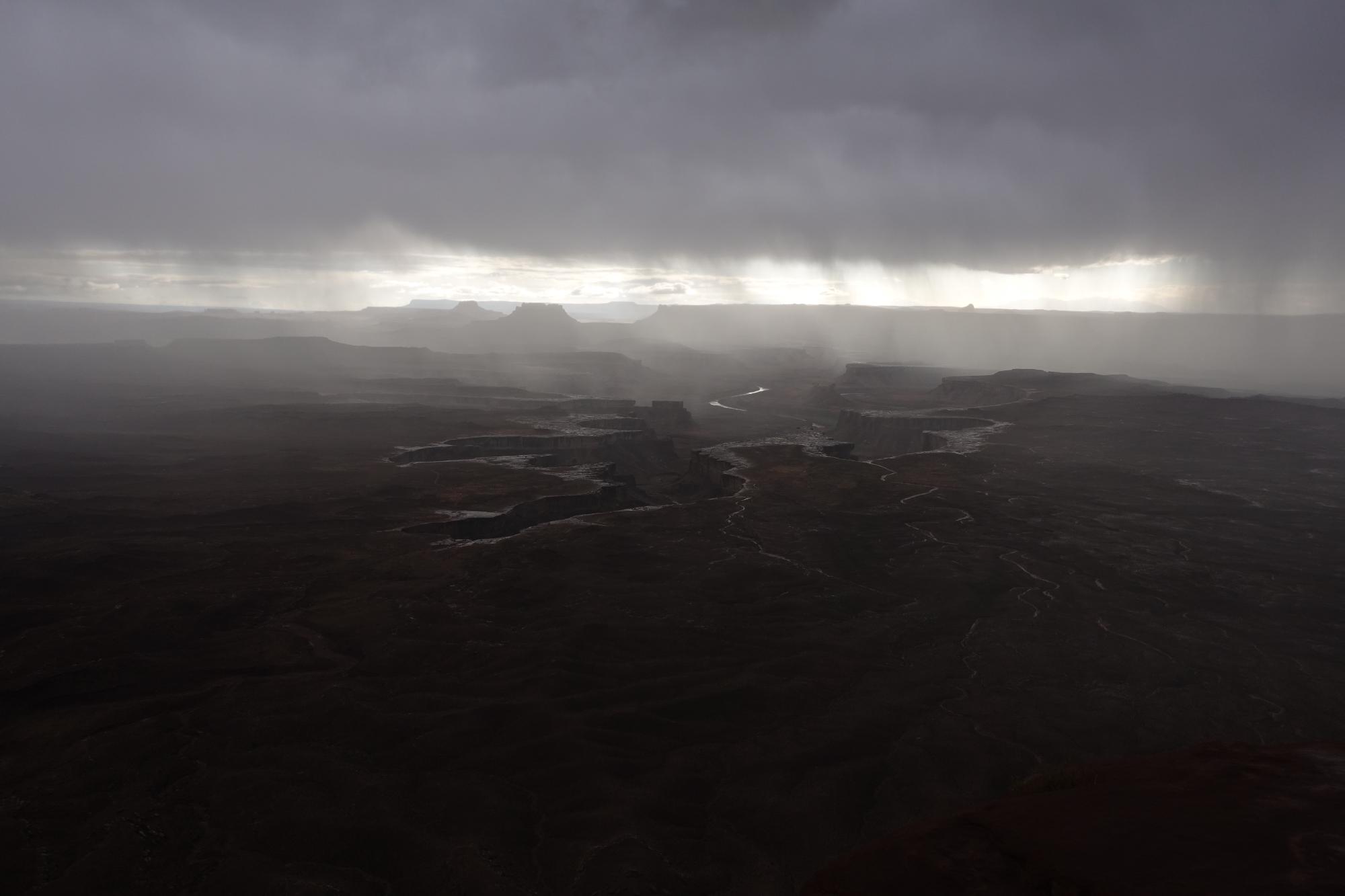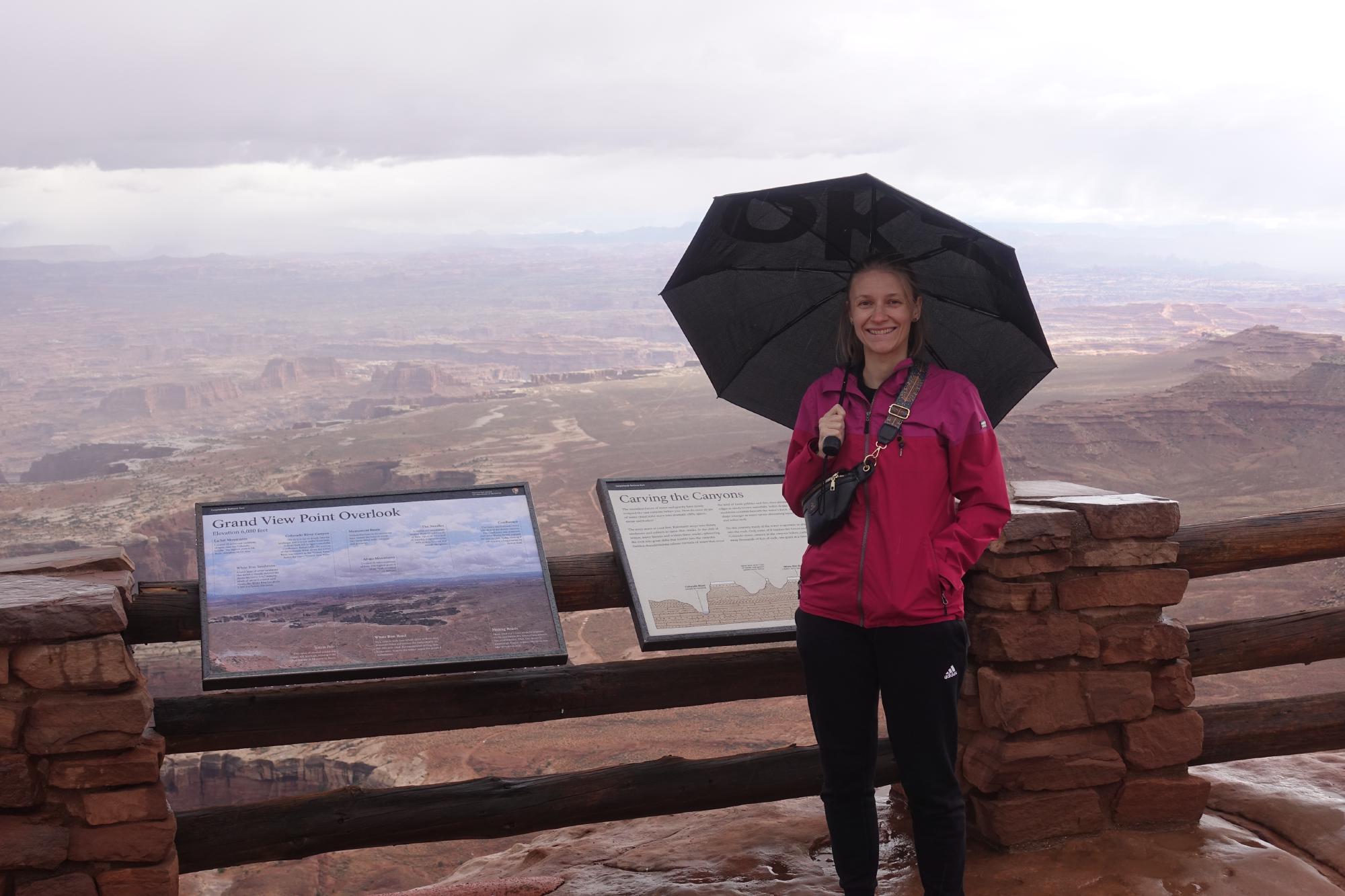 Am Himmel bilden sich imposante Gewitterwolken und wir werden noch Zeugen davon, wie schnell das Wetter hier umschlagen kann. Wir sitzen zum Glück im Camper, als uns ein starker Regenschauer erreicht und zeitweise graupelt es sogar. Wir sehen uns die letzten beiden Viewpoints hier noch an, steigen aber nur noch kurz aus für ein Foto. Regenschirme nützen nichts, der Regen kommt quer!
