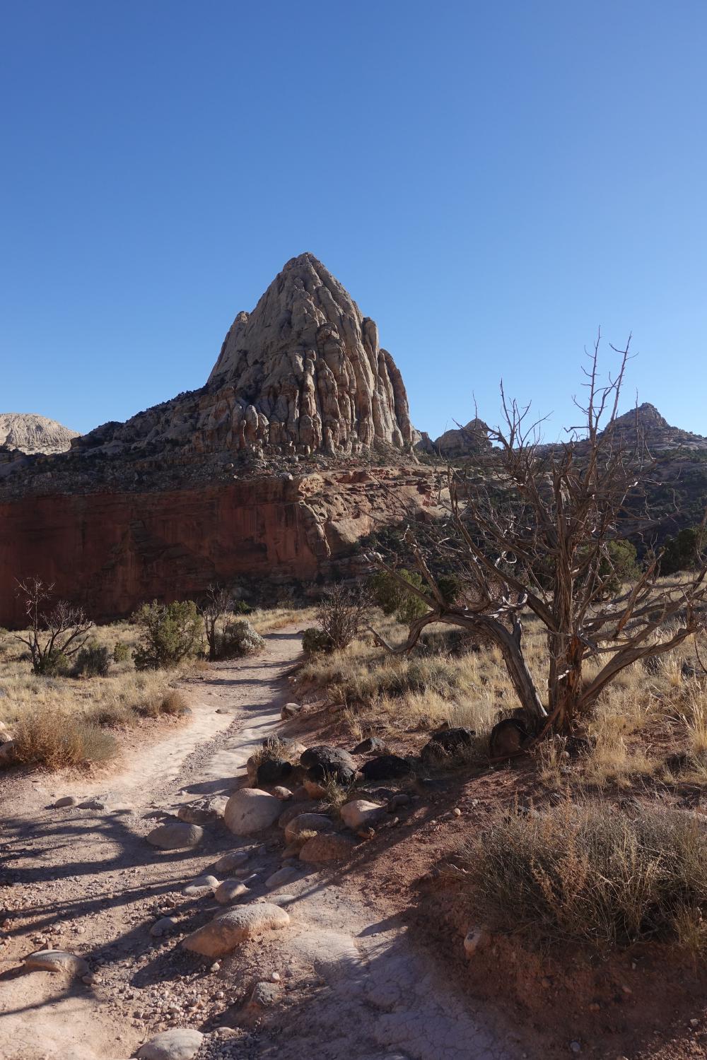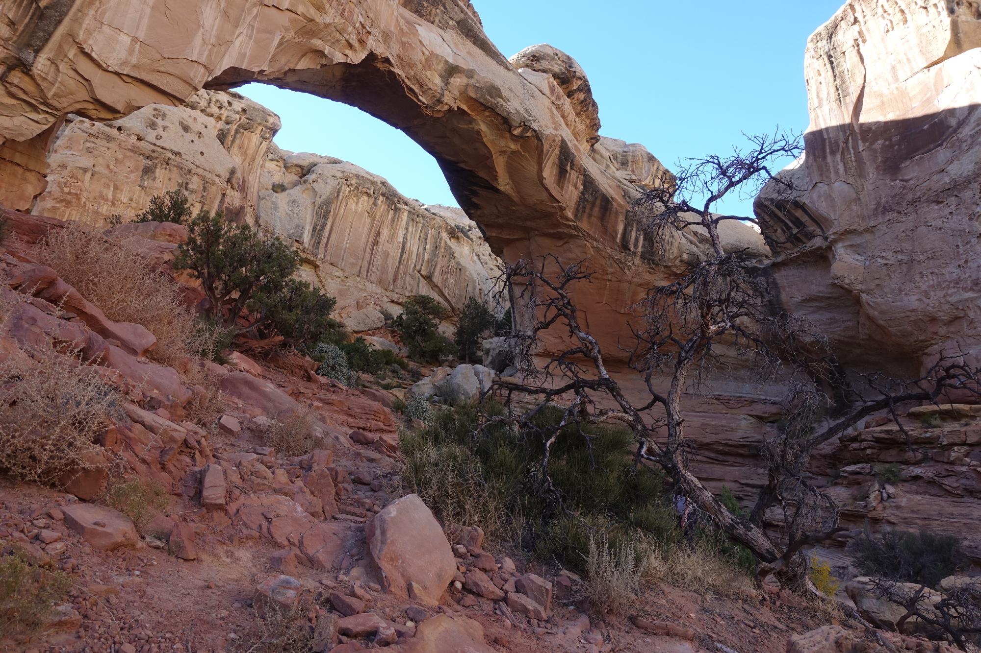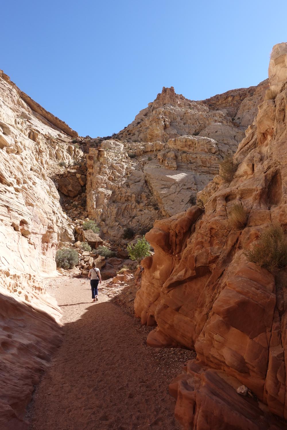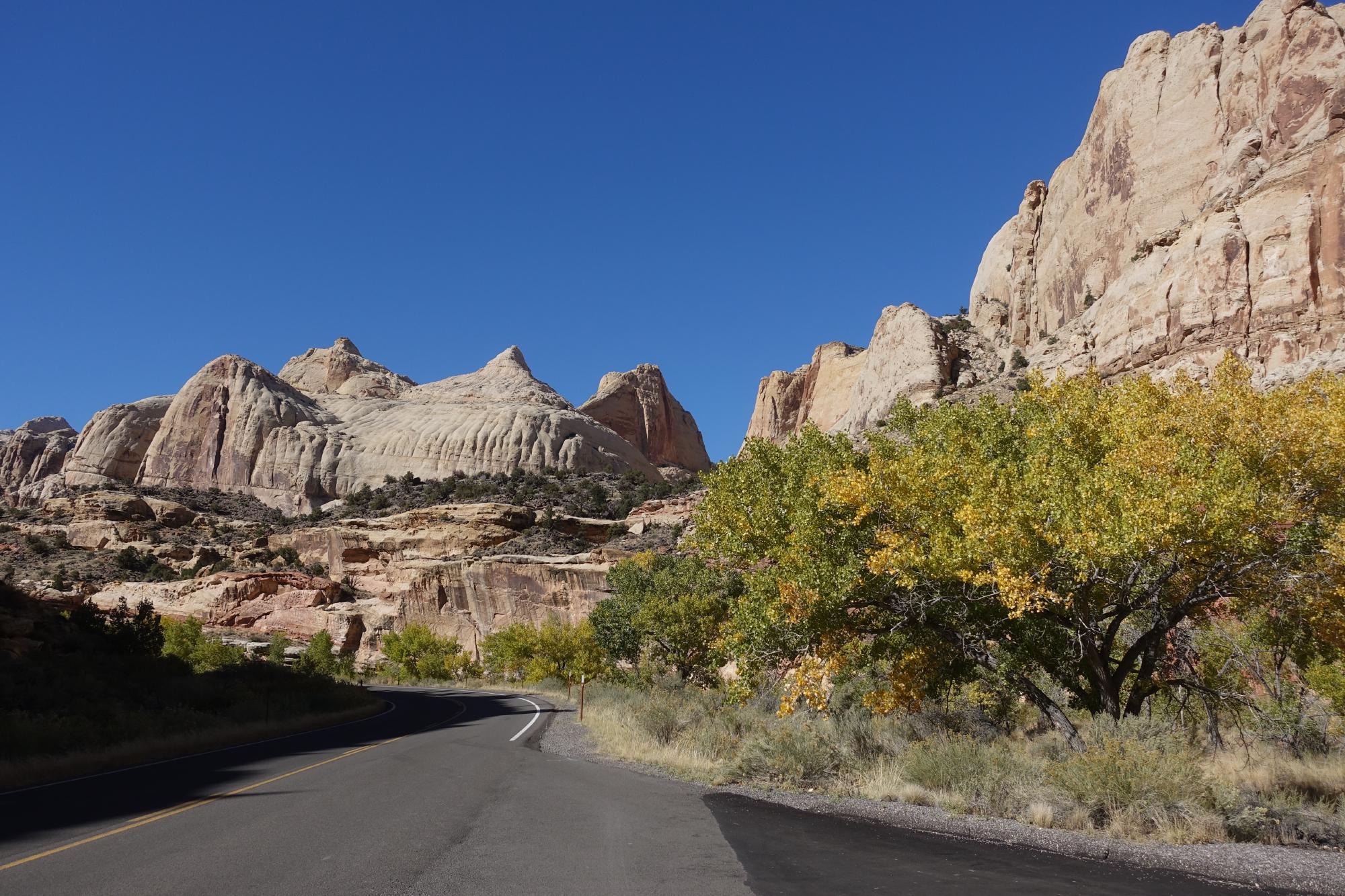 Unsere Route führt uns weiter über lange Strassen durch sich immer abwechselnde Landschaften zum Capitol Reef Canyon Nationalpark. Hier wachsen mitten in der Felswüste Obstbäume, eine Art Oase! Wir unternehmen eine kleine Wanderung zur Hickman Bridge; man könnte meinen, wir hätten Heimweh nach den Bögen der letzten Tage!