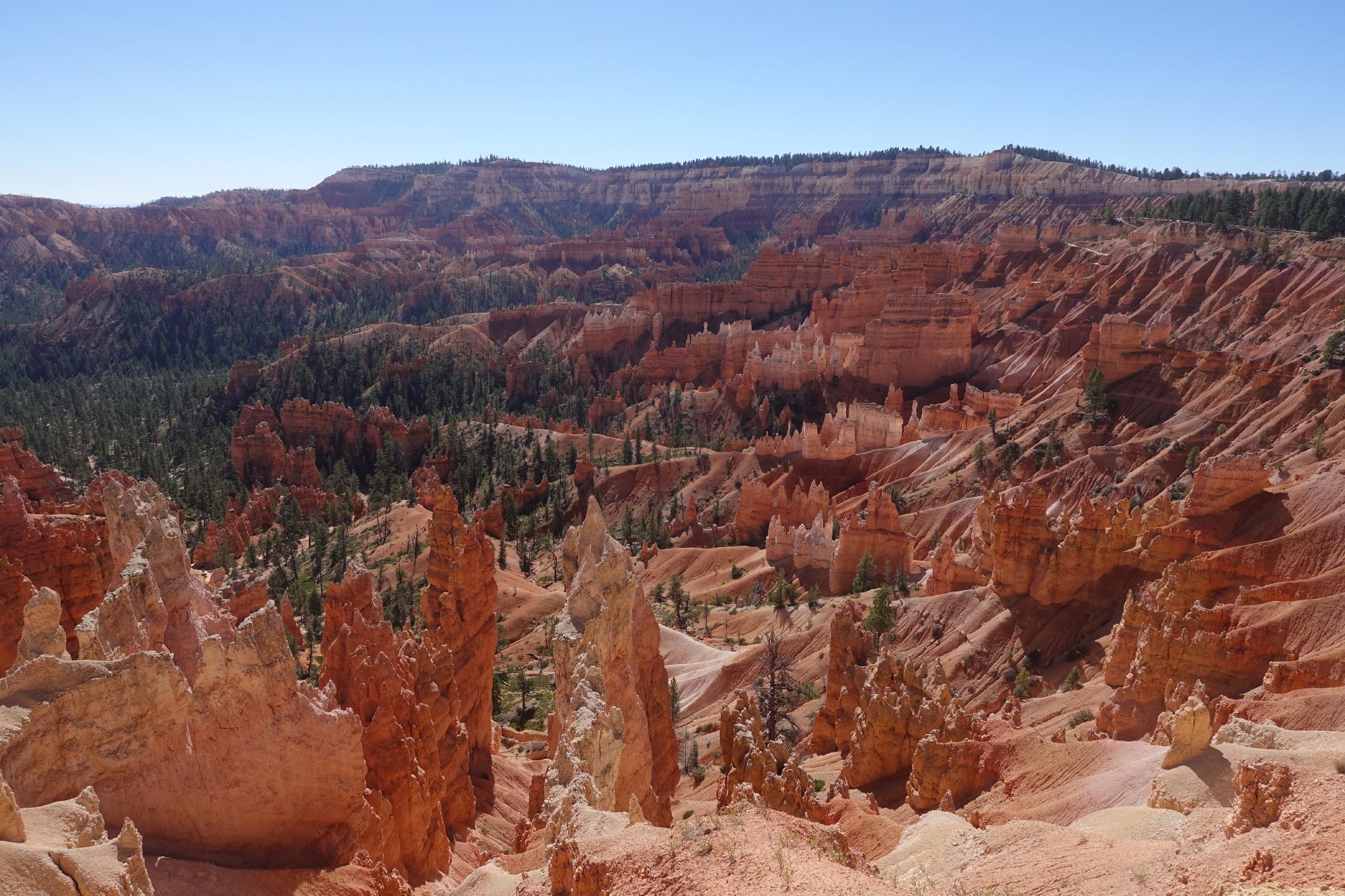 Wir befinden uns im Teil des Nationalparks, der Amphitheater genannt wird. Man kann hier den Rim Trail nehmen und alles der Abrisskante entlang spazieren, oder, und das machen wir, in den Canyon hinunter stechen und zwischen diesen imposanten Türmchen (“Hoodoos”), unter Gesteinsbögen hindurch und weiter unten durch lichte Wälder wandern. Was eigentlich als kleine Runde von 2 km begonnen hat, endet in, wer hätte es gedacht, einer nachmittagsfüllenden Wanderung, an deren Ende wir auf der anderen Seite des Canyons wieder oben ankommen und dann doch noch den Rimtrail zurück zum Camper nehmen. Wie das so ist, haben wir bei jedem Abzweiger noch eine kleine Runde angehängt, weil es so schön war.