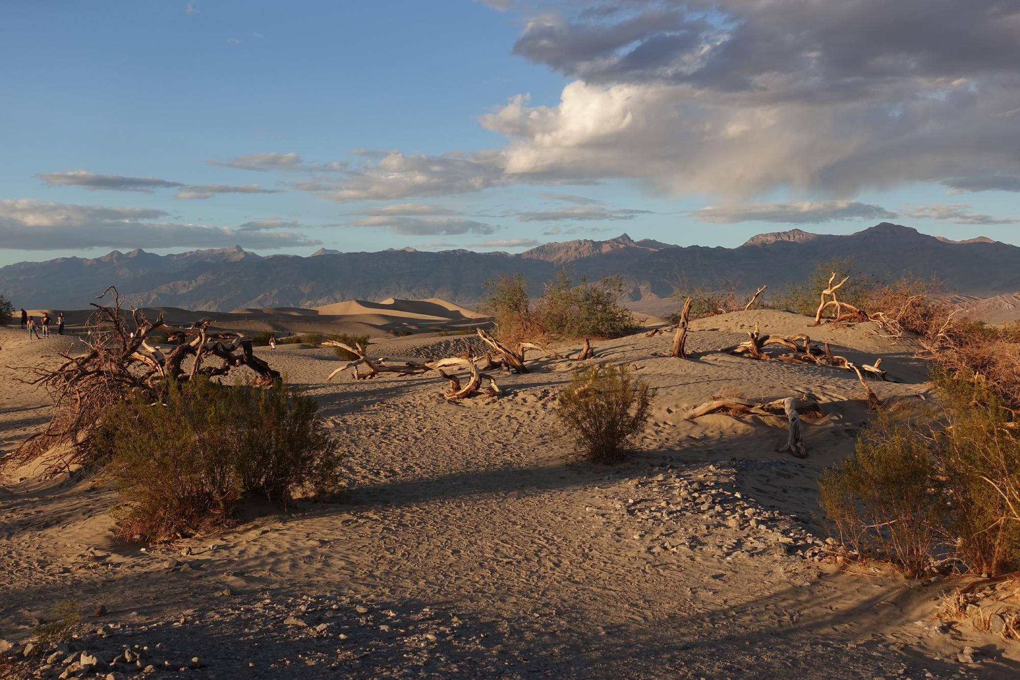 Wir fahren in Richtung Death Valley. Keine Ahnung wieso, aber Simone hat sich das immer als Sandwüste mit feinem weissen Sand vorgestellt. Stattdessen hat es relativ viele kleine Pflänzchen und Büsche, an einigen Stellen Salzteppiche und teilweise fast schwarzes Lavagestein. Die vielfältige Natur gefällt uns super, die weite Ebene mit der frischen Luft ist sehr eindrücklich. Und die Temperatur ist auch sehr erträglich, wir müssen sogar einen Pulli anziehen!
