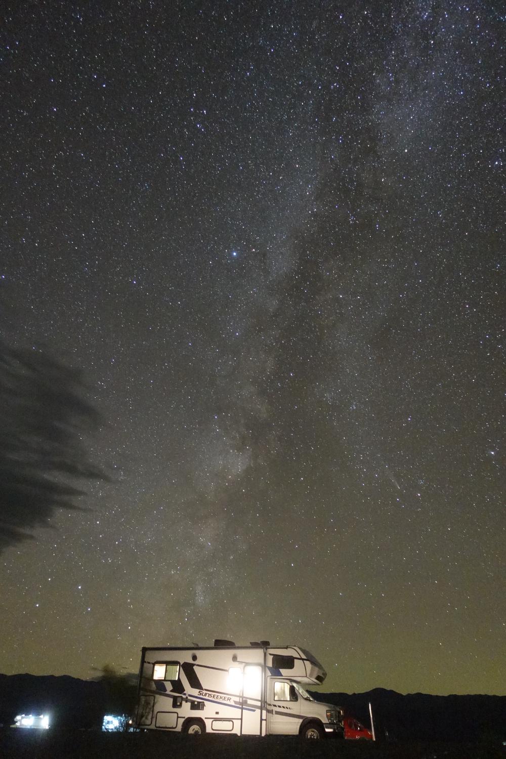 Als es eindunkelt, stellen wir uns auf einen Campingplatz mitten im Nationalpark und freuen uns auf einen wunderbaren Sternenhimmel. Zwar will irgendwie niemand unsere 18 Dollar für die Nacht einkassieren und bei der Dumpingstation passen die Wasserleitung und unser Schlauch nicht aufeinander, aber es reicht uns völlig für die heutige Nacht.