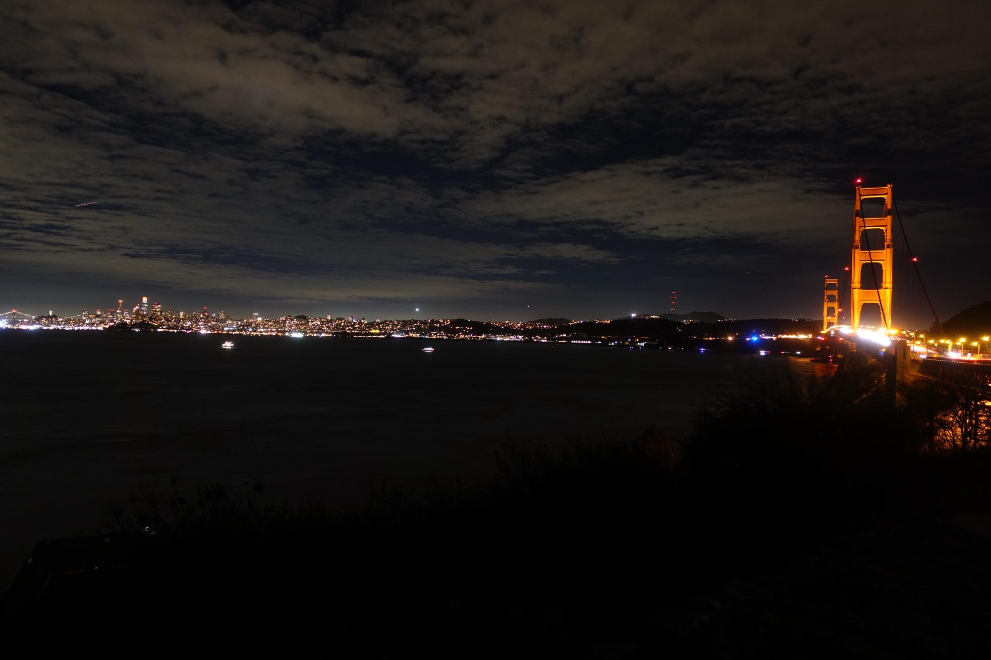 Nach der Besichtigung steigen wir wieder ein und nehmen noch das letzte Stückchen Weg bis nach San Francisco unter die Räder: Unser Ziel für heute Abend ist die Golden Gate Bridge. Marco hat uns hier einen super Parkplatz gleich an der Brücke herausgesucht, auf dem man über Nacht stehen bleiben kann. Wir geben die Route im Navi ein und los gehts. Irgendwann schickt es uns weg von der Autobahn und natürlich direkt durch das Getümmel in der Innenstadt. Klappt ja super, wie wir die Grosstädte mit unserem Camper grossräumig umfahren… Es dauert einen Moment, bis wir realiseren, dass wir gerade über Tramschienen gefahren sind und die Strassen immer steiler werden… Na Bravo, das Navi schickt uns direkt über den steilsten Hügel mitten in der Stadt. Natürlich keine gute Idee mit unserem Problem, dass wir schlecht über steile Schwellen kommen. Bis oben klappts gut, aber auf dem Weg wieder nach unten kratzen wir tatsächlich wieder einmal mit dem hinteren Ende die Strasse. Schliesslich finden wir den Weg aus dem Kuchen heraus und fahren über die Brücke, die auch nachts rötlich schimmert. Auf der anderen Seite finden wir problemlos den erwähnten Parkplatz und reihen uns hier zwischen vier anderen Campern für die Nacht ein. Der Ort ist toll gelegen, man sieht auf die Brücke und über die Bucht auf die Innenstadt von San Francisco.
