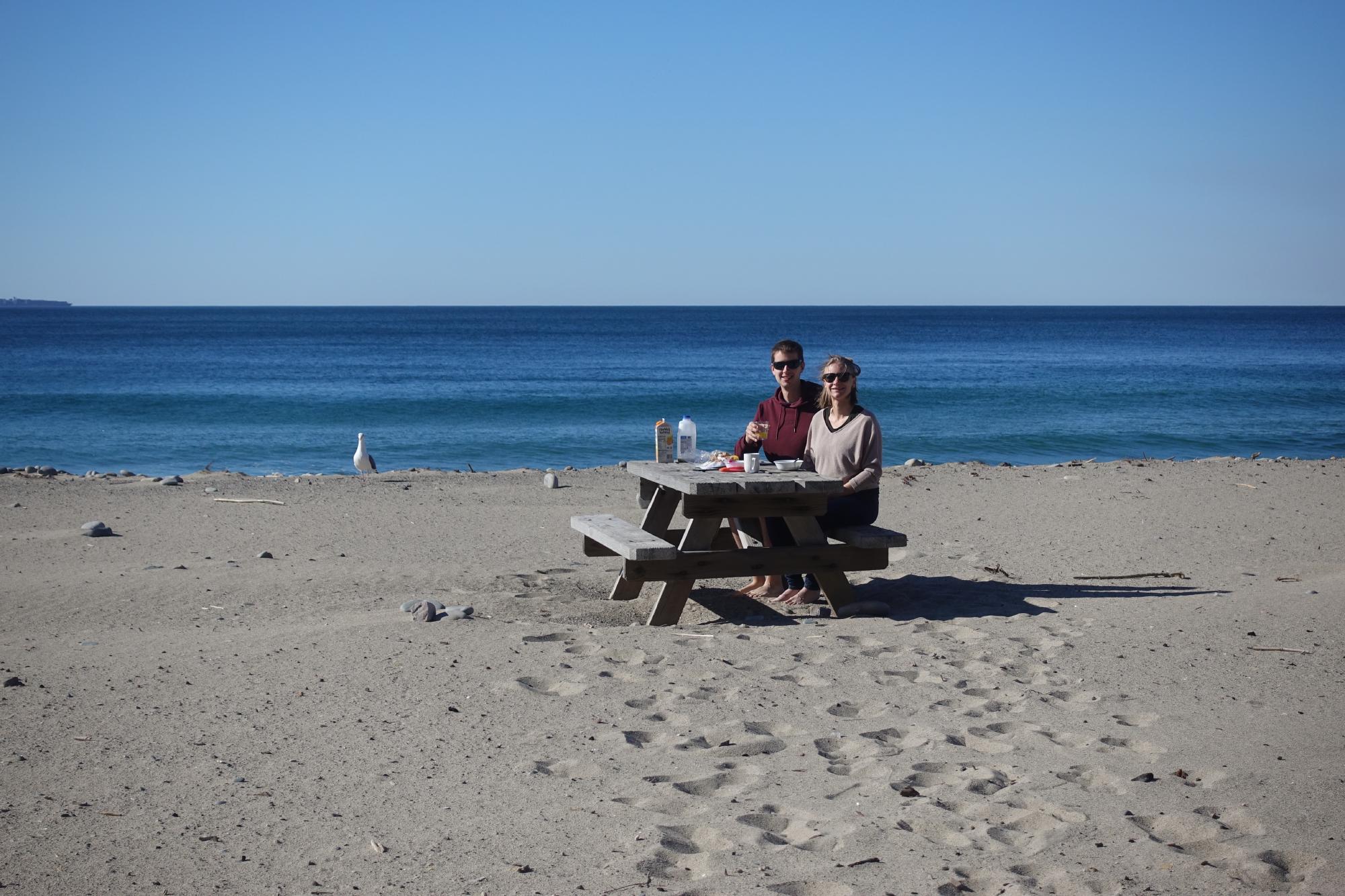Nach einer turbulenten Nacht mit vielen Windböen straht uns am Morgen die Sonne entgegen und wir begutachten unseren kleinen Privatstrand gleich vor dem Wohnmobil; heute wird draussen gefrühstückt! Gleich neben unserem Picknicktisch brausen die Wellen an den Strand und wir geniessen diesen tollen Moment!