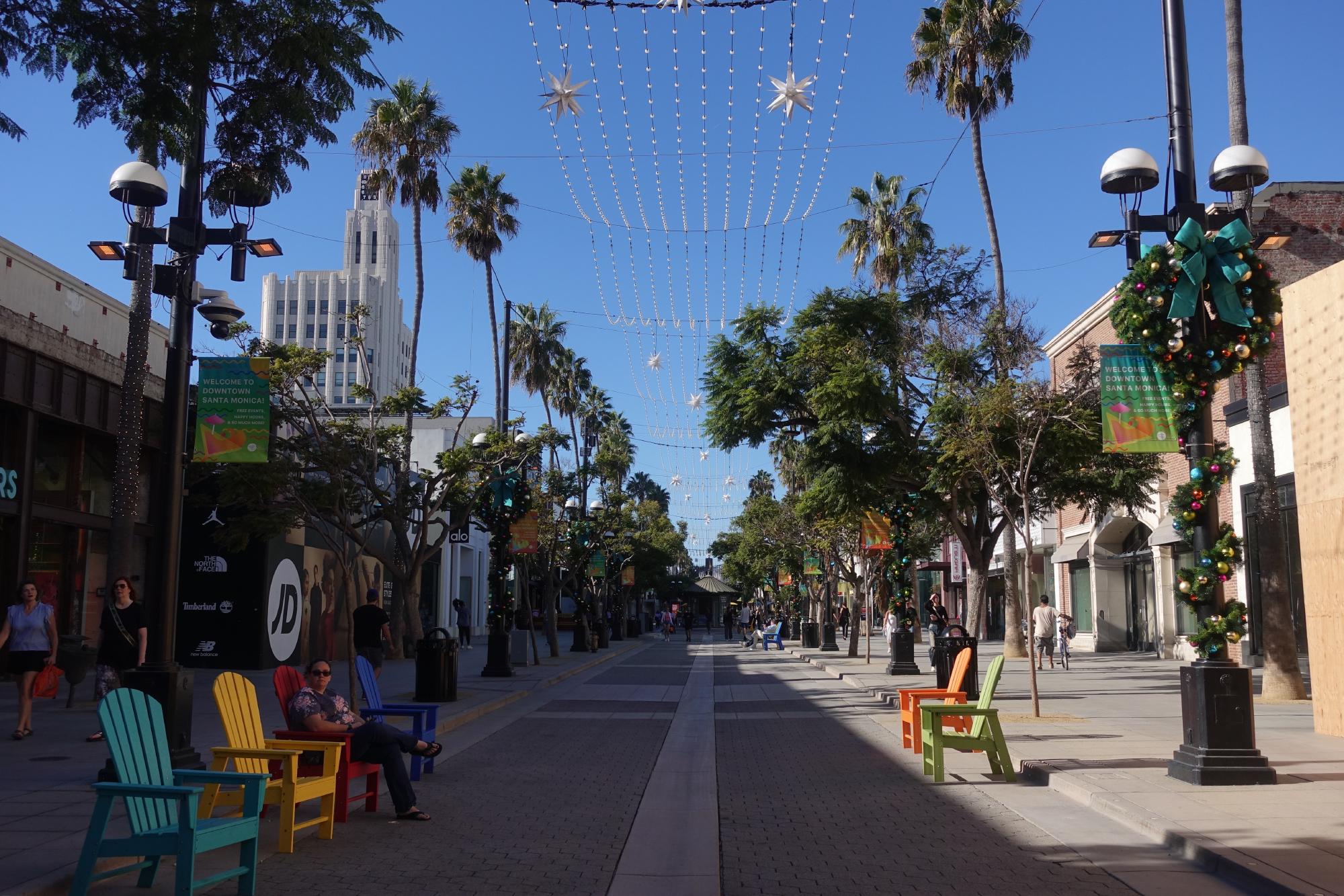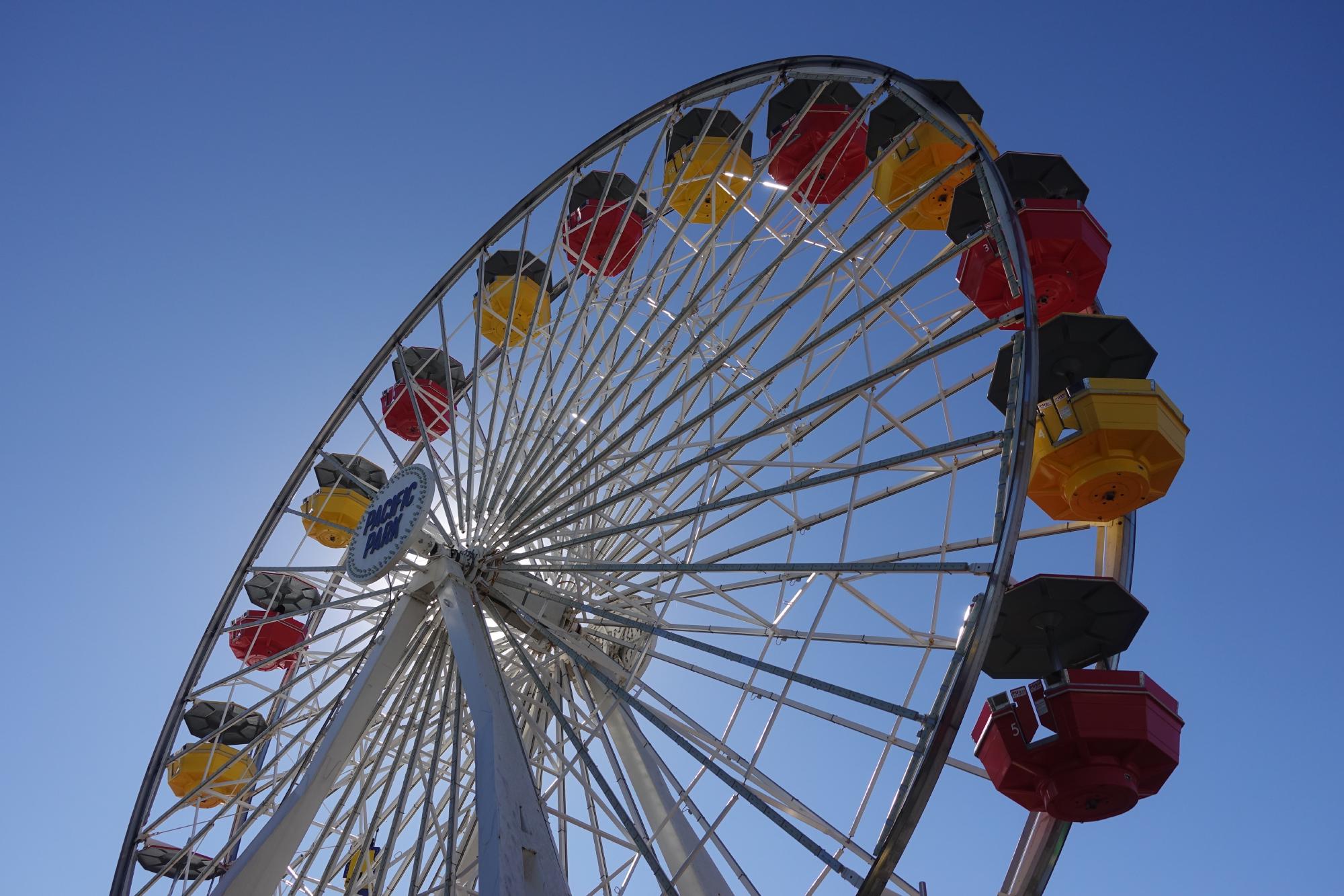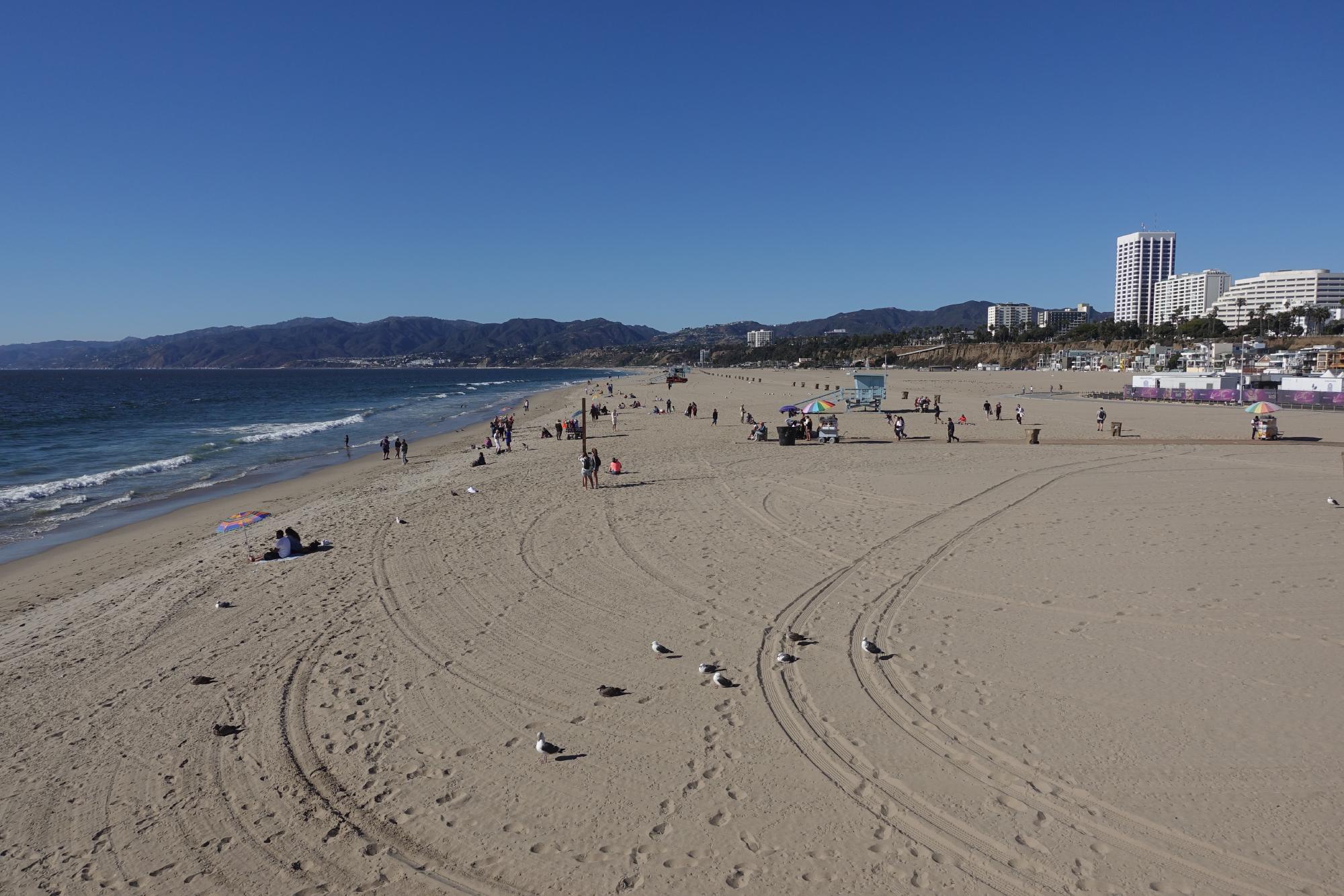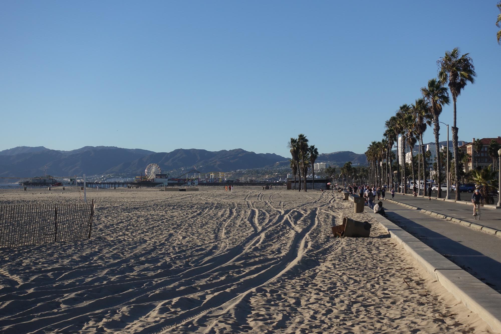 Dann räumen wir alles zusammen und fahren vom Campingplatz, hinein in den Ballungsraum Los Angeles. Die Grossstadt ist riesig und wir werden den ganzen Tag ihren Ausläufern entlang fahren. Unser erstes Ziel ist Santa Monica. Hier kommen wir nach ca. einer Stunde Fahrt und einem kurzen Tankzwischenhalt etwa um zwölf Uhr an und finden einen RV-Parkplatz für den Nachmittag. Zuerst gibts ein paar Resten zum Zmittag, dann streichen wir uns Sonnencreme ins Gesicht und schliesslich gehts los an die Strandpromenade.