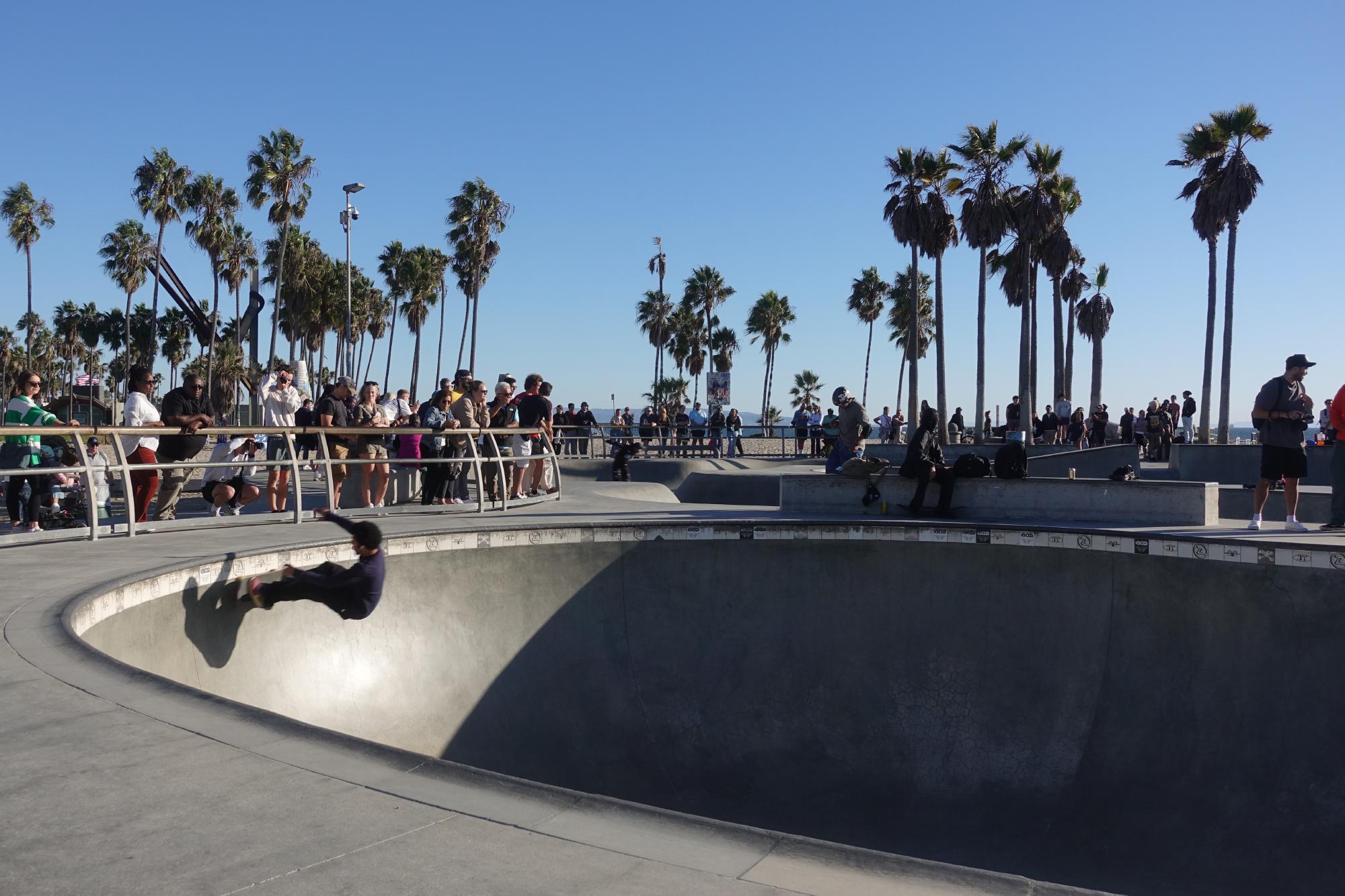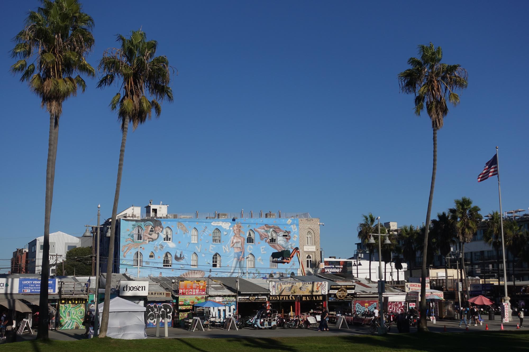 Dann zieht es uns weiter dem Strand entlang nach Venice Beach. Sobald wir die Stadtgrenze von Santa Monica nach Venice Beach überschreiten, kann Simone dem Ausflug aber gar nichts mehr abgewinnen; es stinkt überall nach Kannabis, an jeder Ecke wird einem Handlesen oder Tarot-Karten-Legen angeboten, hie und da kann man magic mushrooms kaufen und dann hat es noch ein paar Kleiderläden, die nur die Unterkörper von Schaufensterpuppen ausgestellt haben und dort stolz irgendwelche Unterhosen mit unlustigen Kommentaren drauf präsentieren. Da muss sie aber durch, denn Marco muss unbedingt im Zentrum von Venice Beach noch ein Foto schiessen. Und hier sind sie, seine Trophäen, für die wir weite Kilometer an schaurigen Ständen vorbei und durch stinkende Zonen marschiert sind: