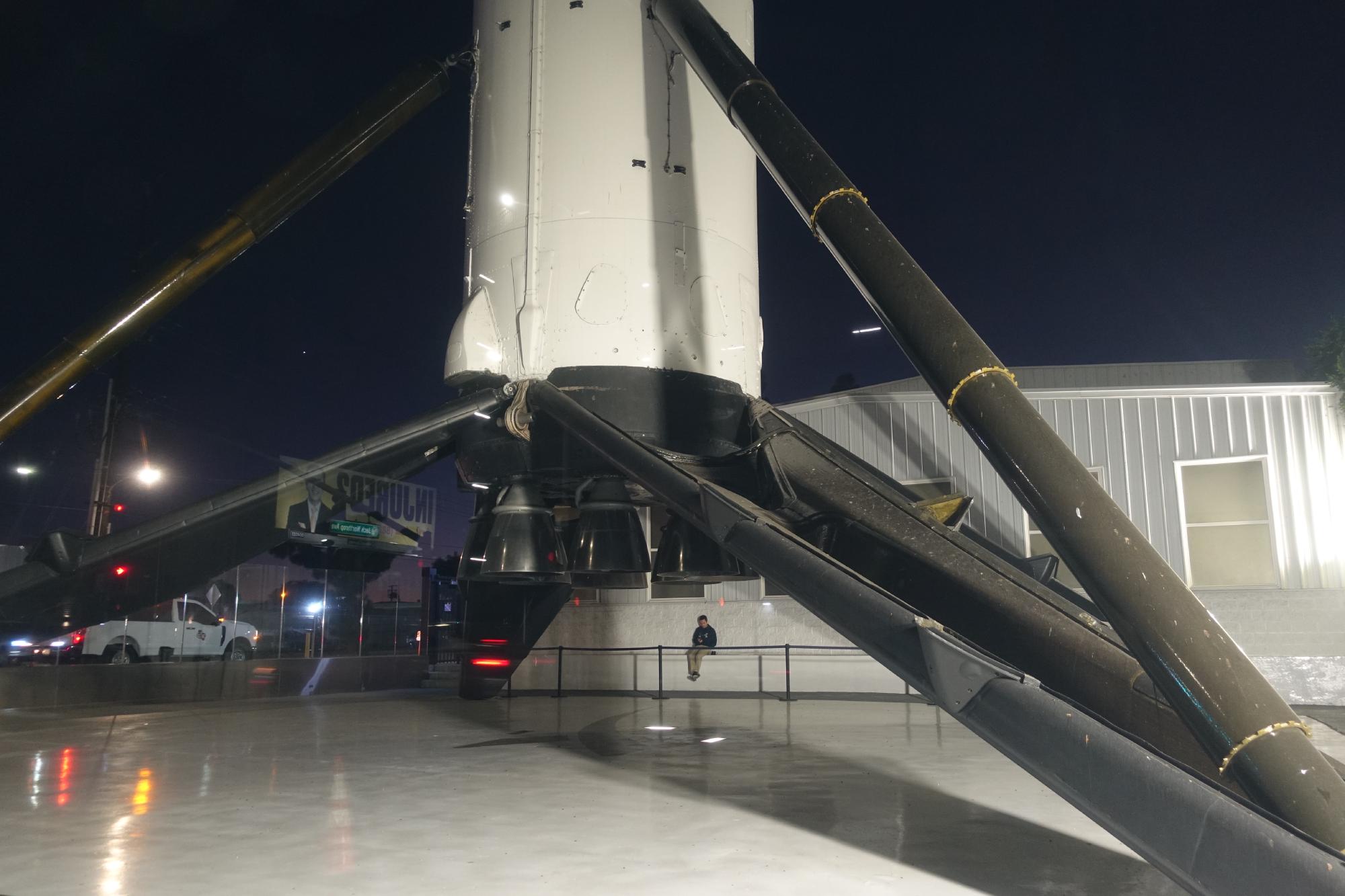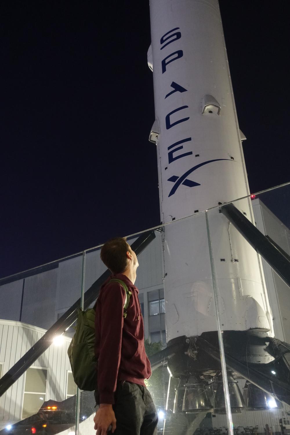 Wir fahren also anstatt in zwanzig Minuten in einer Stunde und 15 Minuten zum Hauptsitz von SpaceX, wo wir kurz aussteigen, damit Marco ein Bild mit dem Raketenbooster vor dem Haupteingang machen kann.