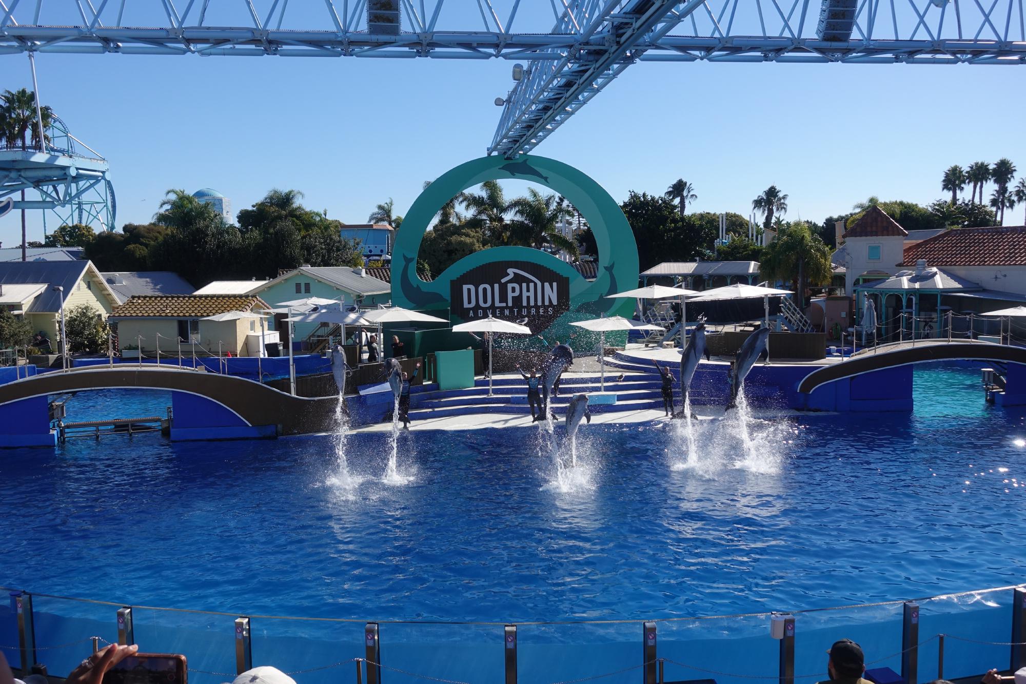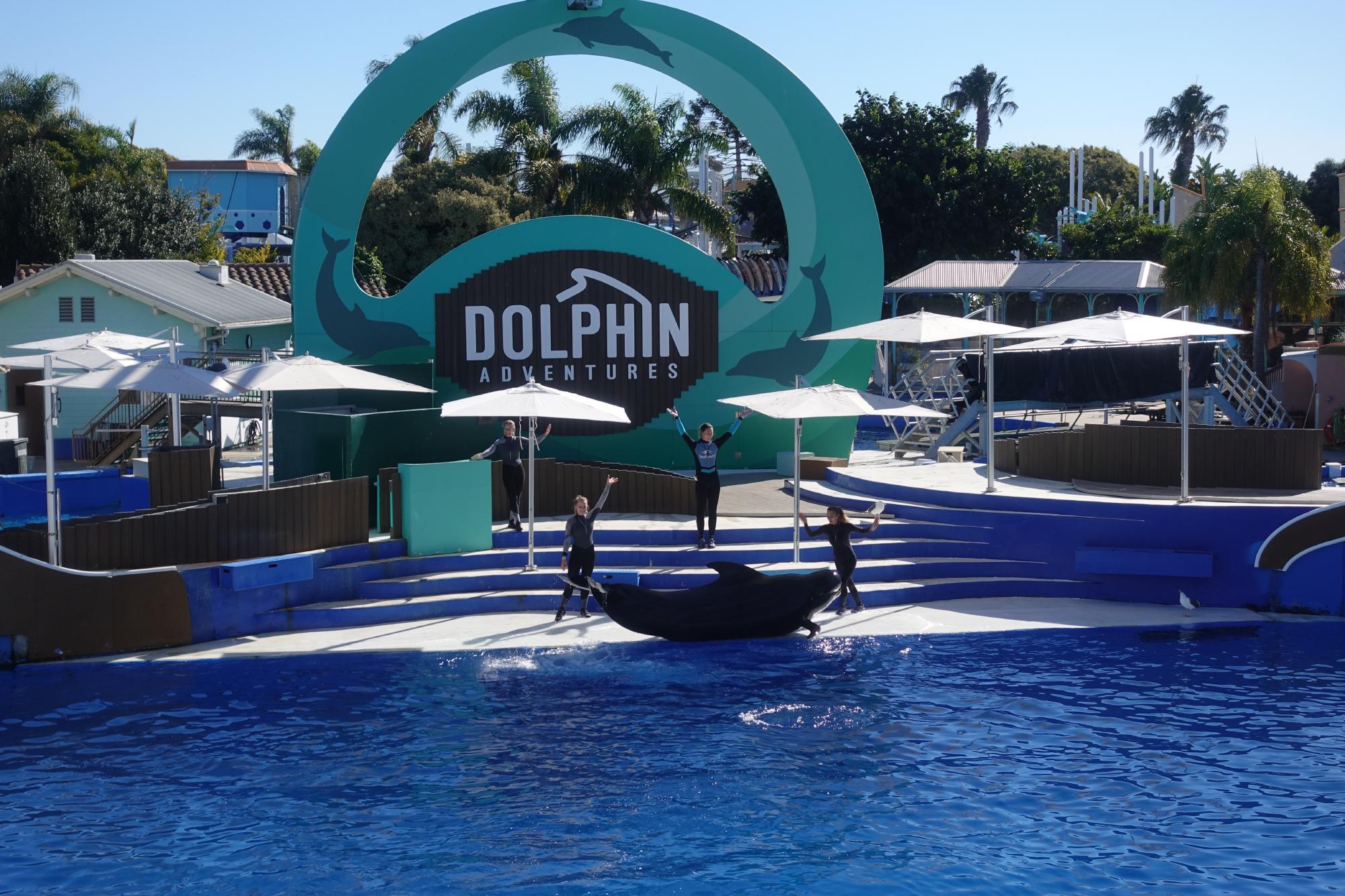 Gleich im Anschluss liefern uns die Delfine mit ihren Trainern die nächste Show. Zu Marcos Freude wird im Vorprogramm immer noch der “Soak Song” gespielt, um das Publikum in den ersten paar Reihen vorzuwarnen (“It’s a 50-50 bet, that you’ll get 100% - WET!”). Und wir lachen herzhaft, als die besungenen Besucher tatsächlich wie begossene Pudel dasitzen, nachdem die Tiere mit ihren Flossen ganze Flutwellen und Fontänen in ihre Richtung geschleudert haben! Die Delfine können ca. 300 Kommandos und zeigen uns während der Show einige davon. Wie schon beim letzten Delfintreffen im Aquarium in Genua ist Simone völlig verzaubert und ergriffen von diesen Tieren. Zum Glück gibt es am späteren Nachmittag gleich nochmals eine Show!