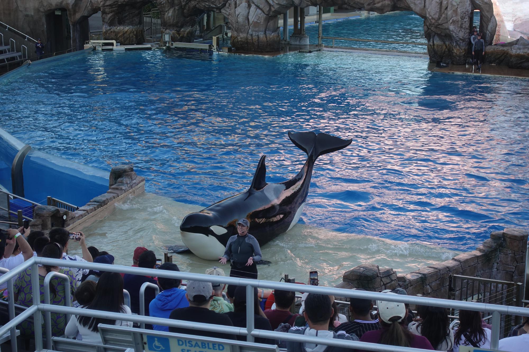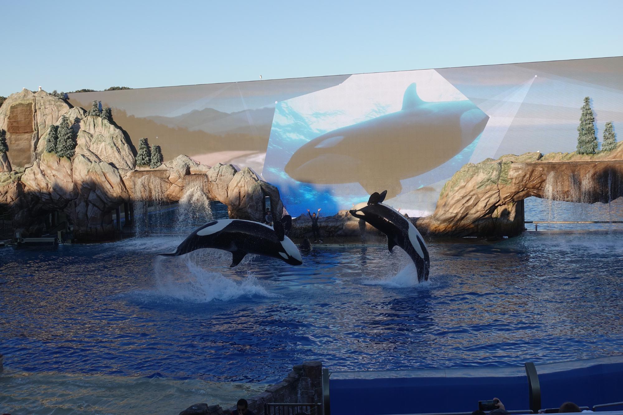 Um vier Uhr schauen wir uns die Orca-Show an, die von einer grossen Videoleinwand ergänzt wird. Auch hier werden die Zuschauer in den vorderen Reihen gehörig nass.
