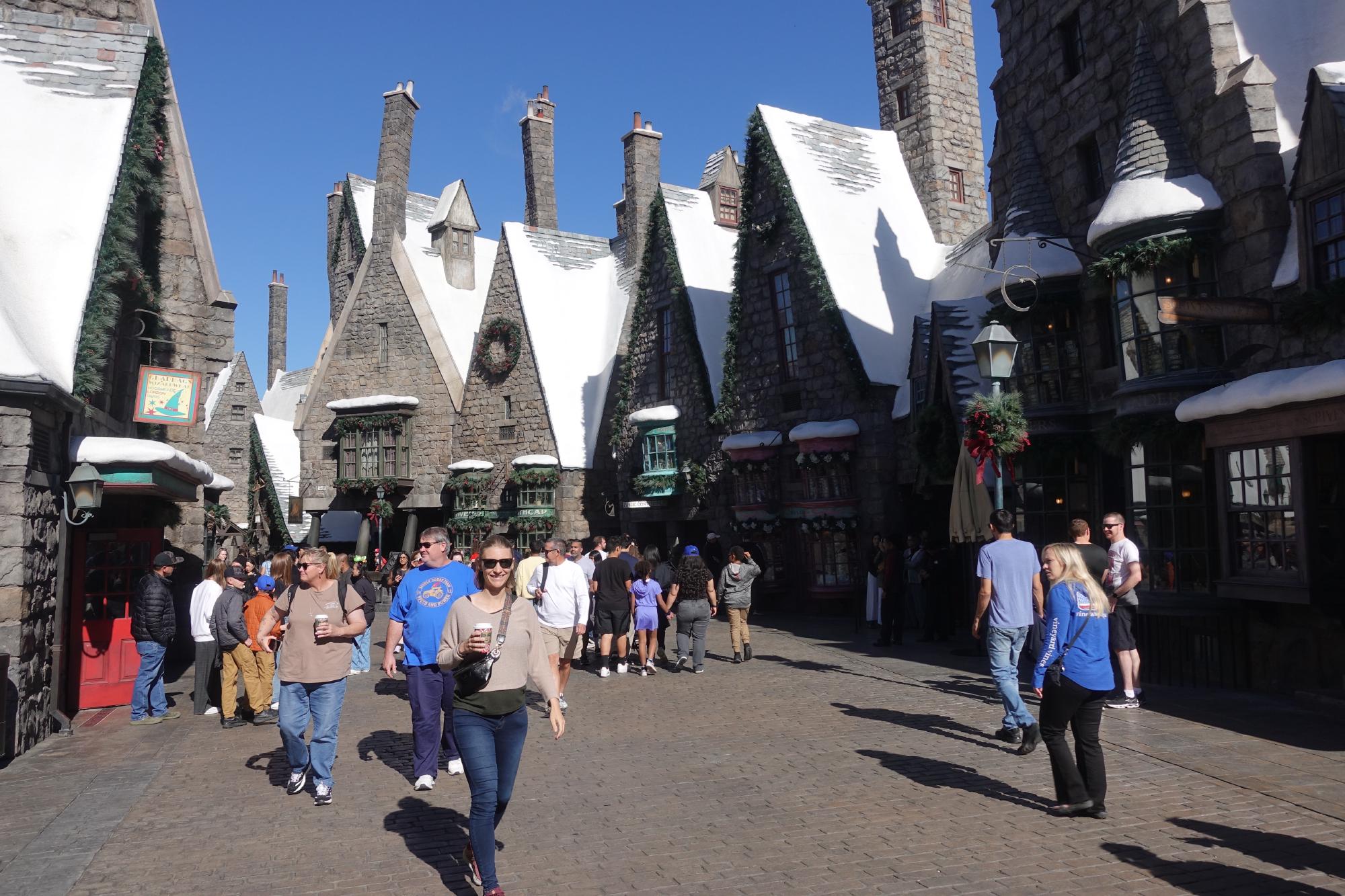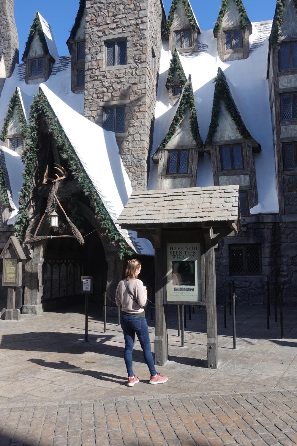 Irgendwie kommt etwas Europaparkfeeling auf, als wir die Musik hören und uns überall verkleidete Filmfiguren begegnen! Wir treffen Shrek und Fiona, Dracula, zwei Transformers und noch ein paar andere, die wir gar nicht erkennen. Wir gönnen uns einen Cappuccino und einen Orangensaft und starten zuerst im Harry-Potter-Universum (eigentlich Warner-Bros-Filme, aber Universal hat scheinbar die Lizenz, um eine ganze Ecke des Parks der magischen Welt zu widmen). Hier findet man ein nachgebautes Hogsmeade mit haufenweise Zauberwelt-Läden: bei Olivander’s kann man (Plastik-)Zauberstäbe kaufen, im Eulengeschäft gibt es (Plüsch-)Briefeulen und überall gurrt und pfeift es und die Eulen drehen ihre Köpfe so weit herum wie echte.