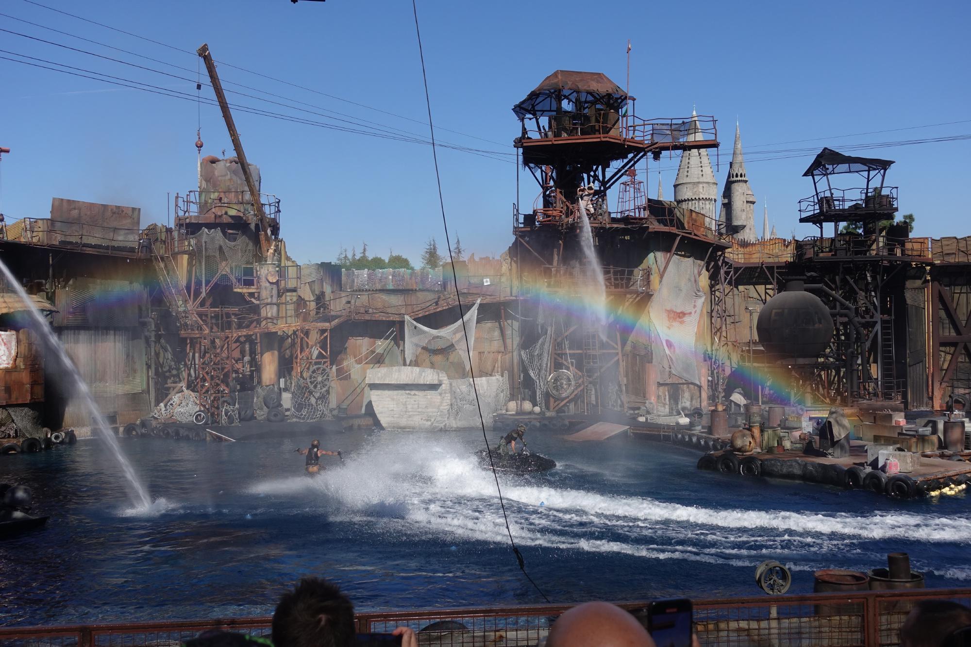 Den Rest des Morgens verbringen wir in der Ecke, in der alles zum Thema Minions dekoriert ist. Wir schnappen uns dann vor dem grossen Ansturm einen Feta-Spinatstrudel zum Zmittag (das Essensangebot überzeugt hier um einiges mehr als im SeaWorld) und sehen uns um 12:15 Uhr die Waterworld-Show an. Es handelt sich um eine Stunt-Show ohne sinnvollen Handlungsfaden, aber mit gut simulierten Schiessereien, Stunts aus höchster Höhe ins Wasser und durch die Gegend fliegenden Booten und Flugzeugen, Feuerwerk, mittelgrossen Explosionen und Feuerwänden. Natürlich gibts auch hier wieder eine Wet-Zone wo man gehörig nass wird. Das Konzept funktioniert, um allgemeine Freude auszulösen. Marco gefällts. Simone schüttelt nur den Kopf ab so viel unnötigem Geballer; nur die Köpfler aus zehn Metern Höhe haben sie beeindruckt.