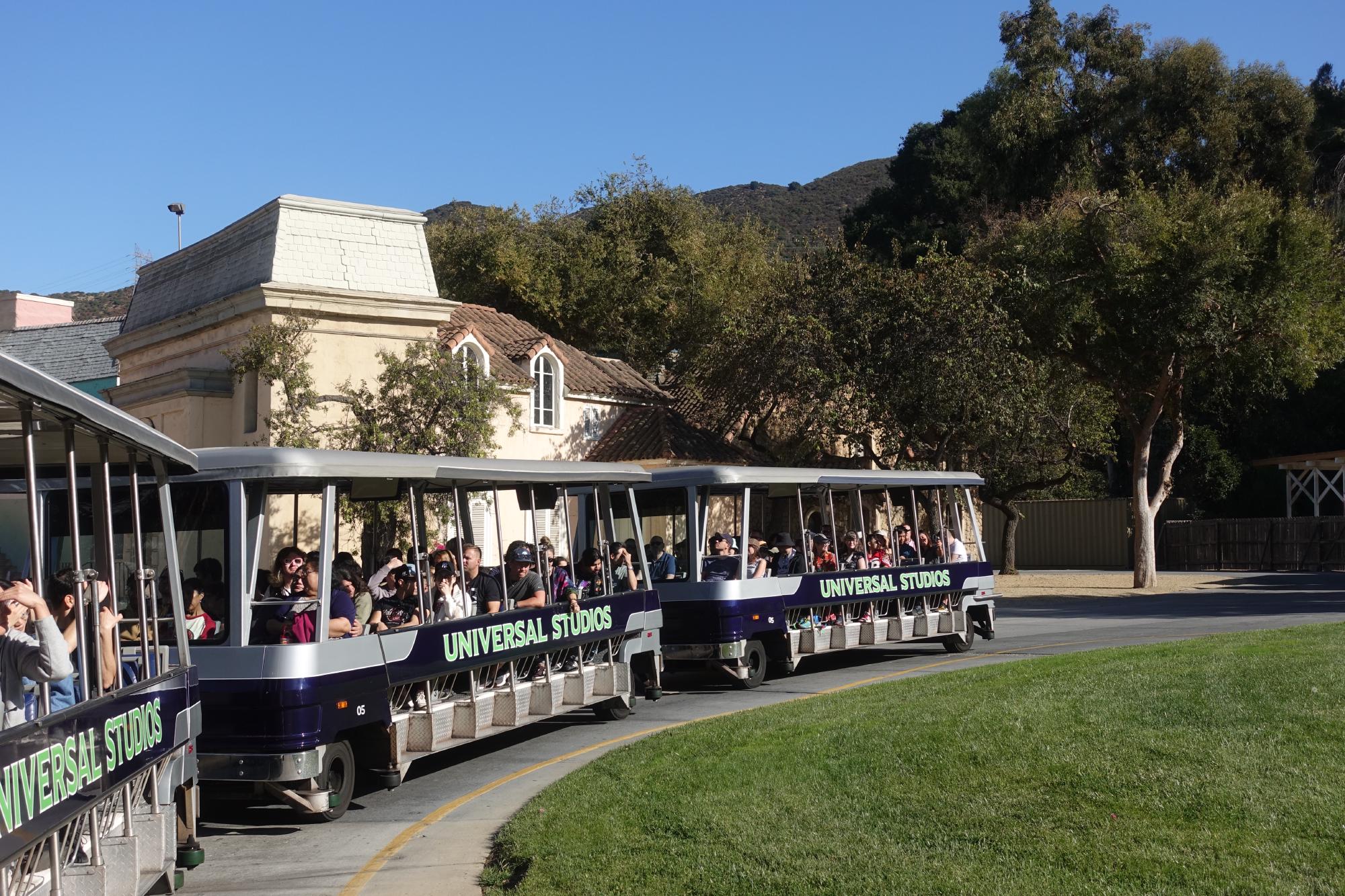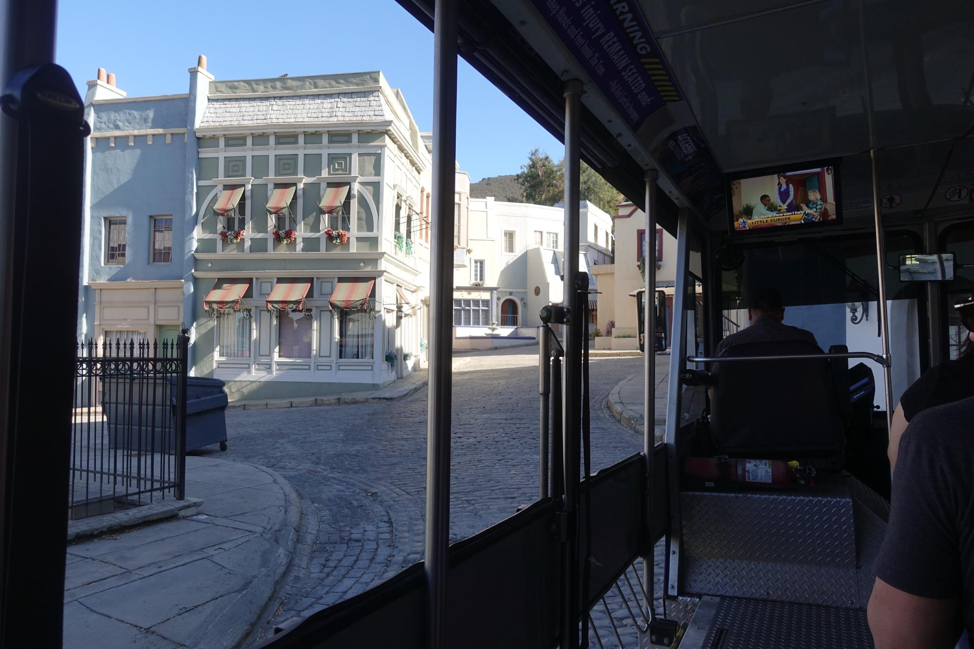 Als nächstes stellen wir uns zehn Minuten in die Schlange, um die Studio-Tour zu besuchen (wir müssen übrigens nirgends lange anstehen, wir sind wieder einmal in der Nebensaison zu Besuch). Hier fahren wir in einem Büssli (“Tram”) an den Filmset-Hallen vorbei, in denen irgendwelche amerikanische Ferhsehserien gedreht werden. Dann geht die Fahrt an Outdoor-Filmsets vorbei, wo z.B. die Serie Desperate Housewives gedreht wurde. Dann fahren wir noch in eine Halle, wo wir mit 3D-Brillen ausgestattet in einen Streit zwischen Dinosauriern und King Kong geraten und samt Tour-Büssli heftig durchgeschüttelt werden. Natürlich erschrecken sie uns noch mit einem weissen Hai, als wir an einem Tümpel vorbeikommen und kurz darauf werden wir fast von einem simulierten Unwetter fortgeschwemmt.