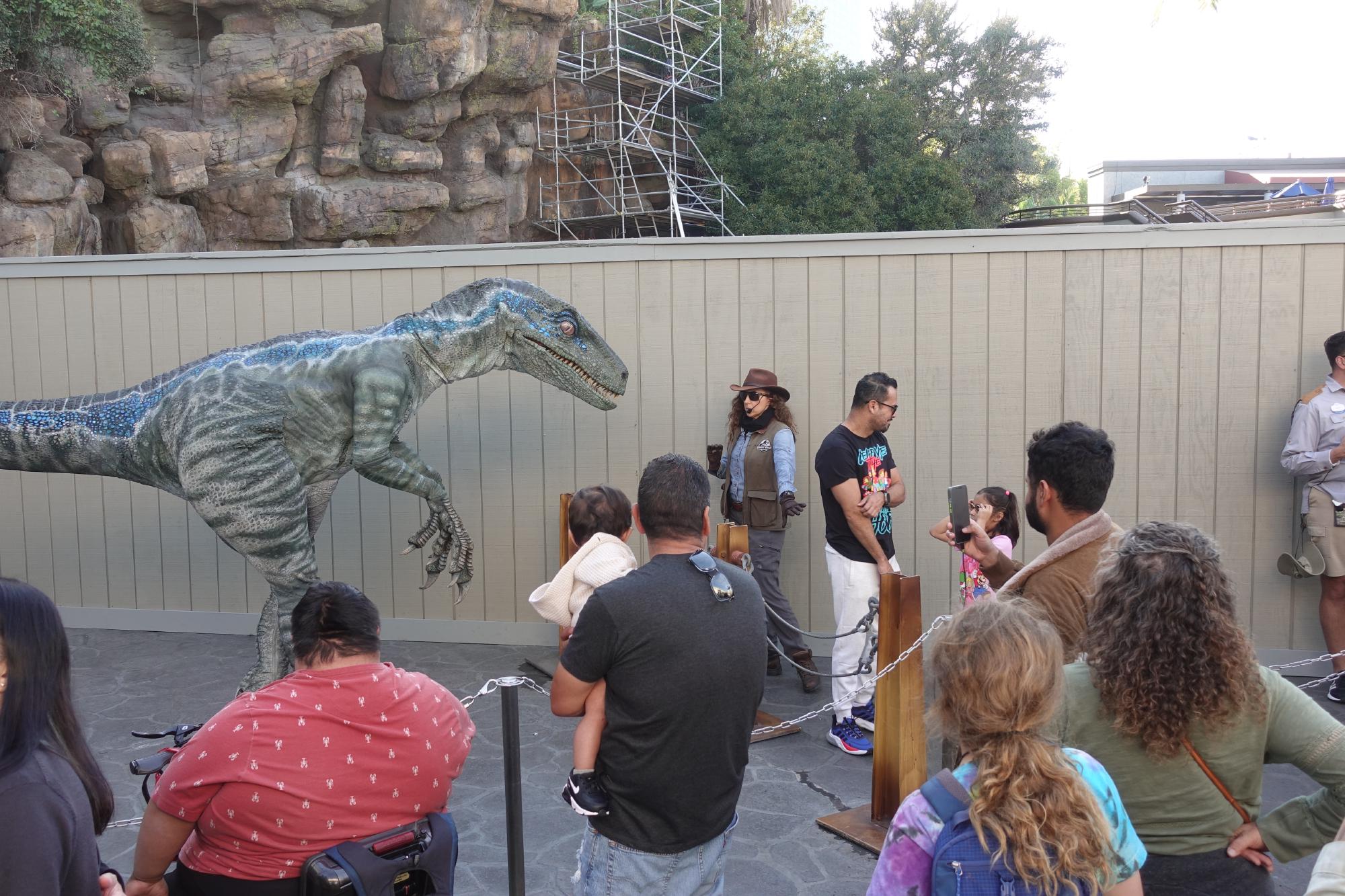 Die Fahrt dauert etwas mehr als eine Stunde, dann sind wir zurück am Ausgangpunkt und wieder zu Fuss durch den Park unterwegs. Vorbei an einer riesig grossen Achterbahn im Bau, die erst 2026 eröffnet wird, begeben wir uns über vier lange Rolltreppen in den unteren Teil des Parks. Im Jurassic Park versucht gerade eine Wärterin, den Veliciraptor dazu zu bringen, nicht die Leute zu fressen, die mit ihm ein Foto machen wollen.